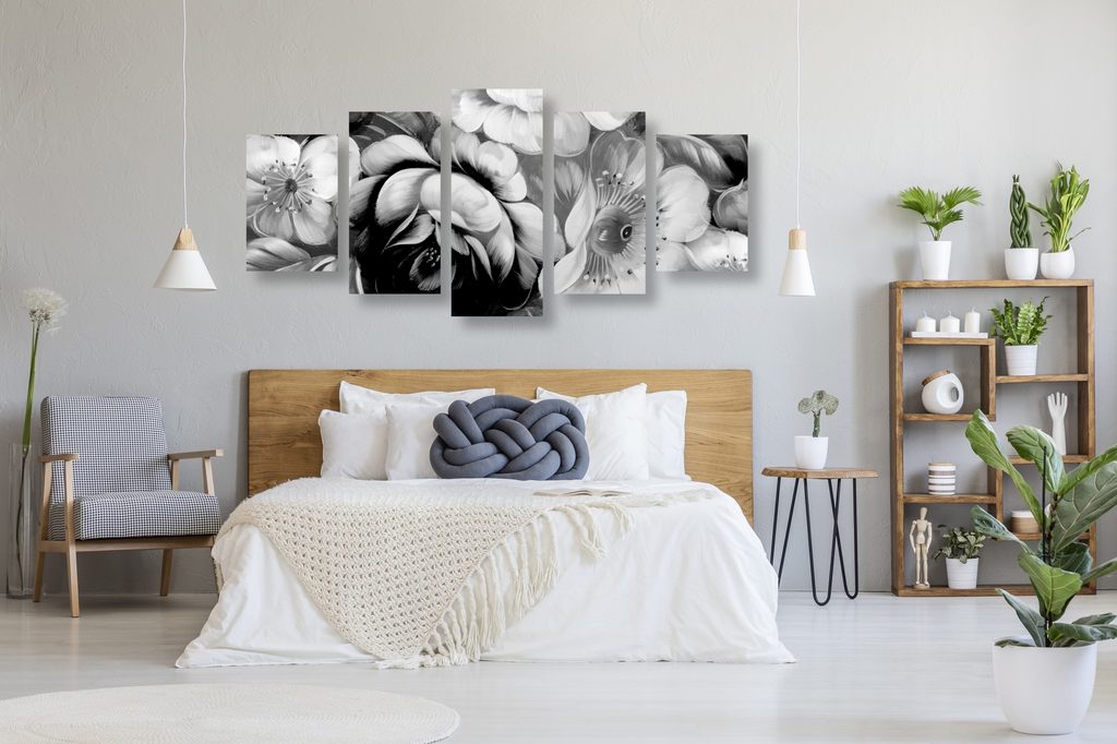 5-dielny obraz nádherné kvety s tajomným pozadím v čiernobielom prevedení