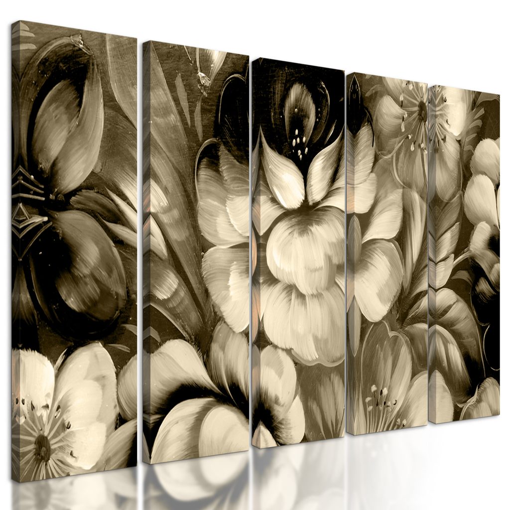 5-dielny obraz abstraktná maľba kvetín v sépiovom prevedení