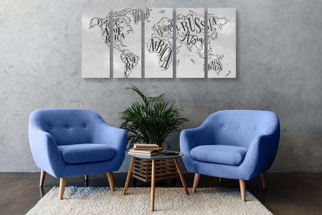 5-dielny obraz abstraktná mapa celého sveta v čiernobielom prevedení
