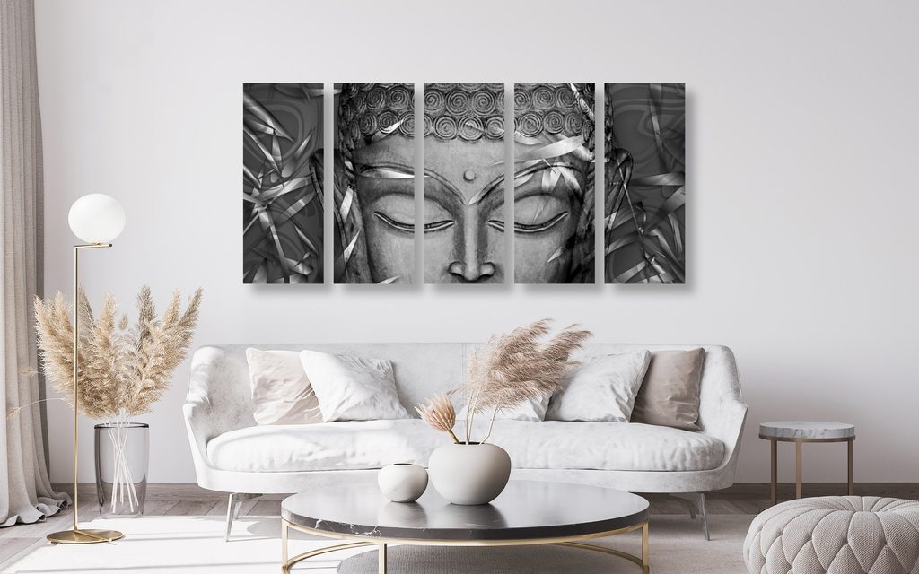 5-dielny obraz abstraktný Budha v čiernobielom prevedení