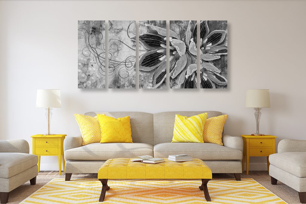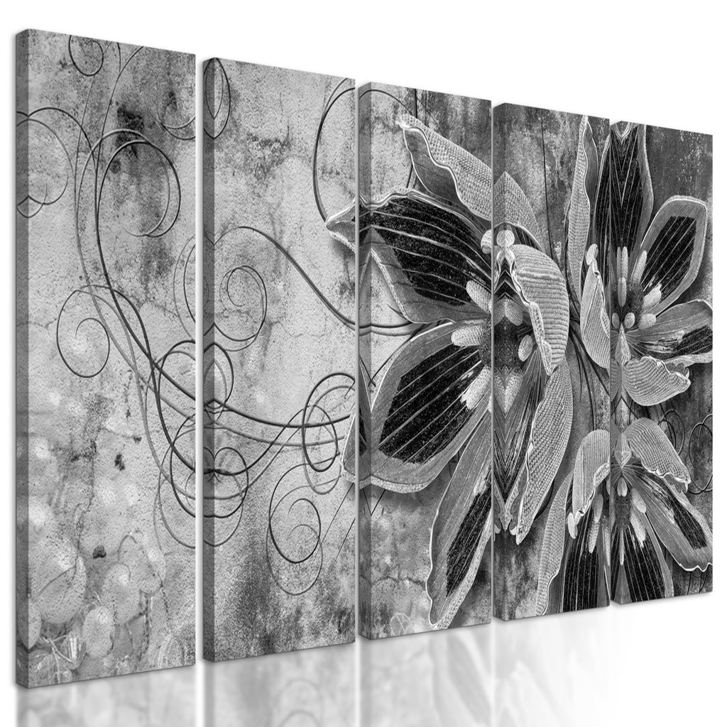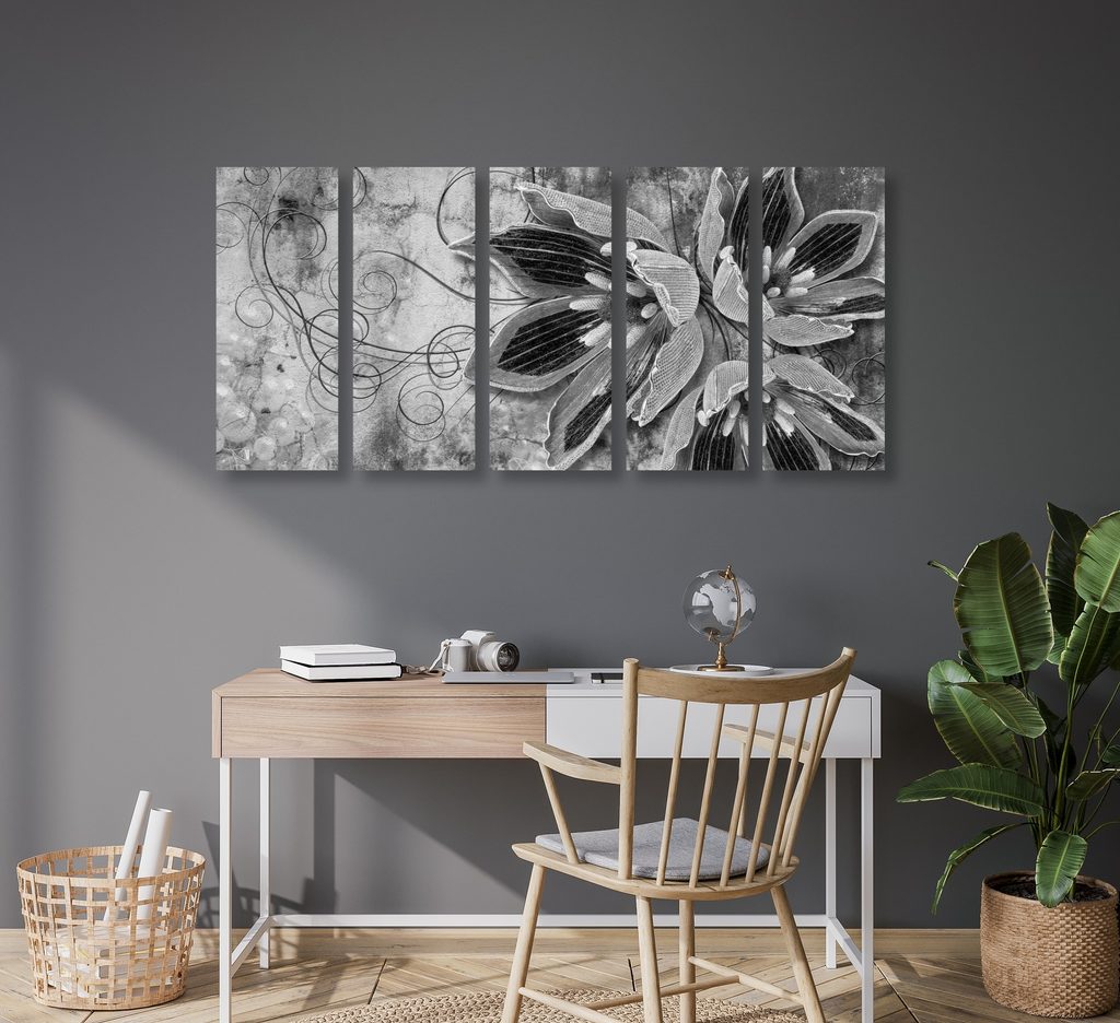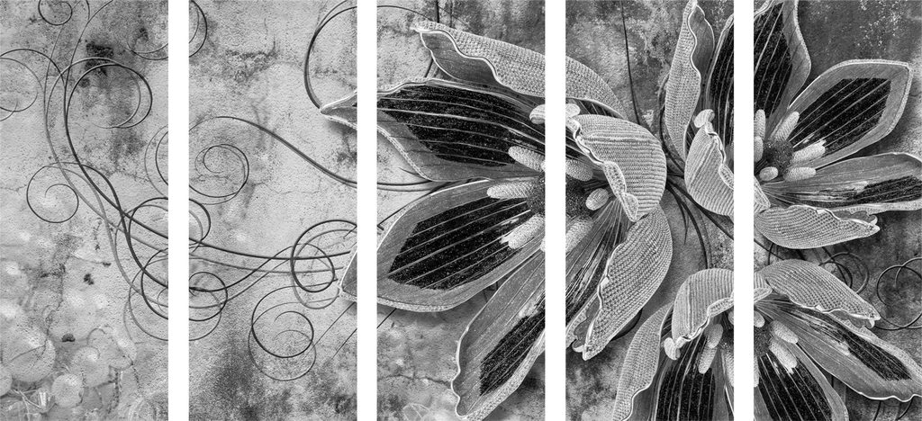 5-dielny obraz abstraktný kvet v čiernobielom prevedení