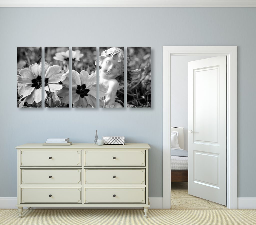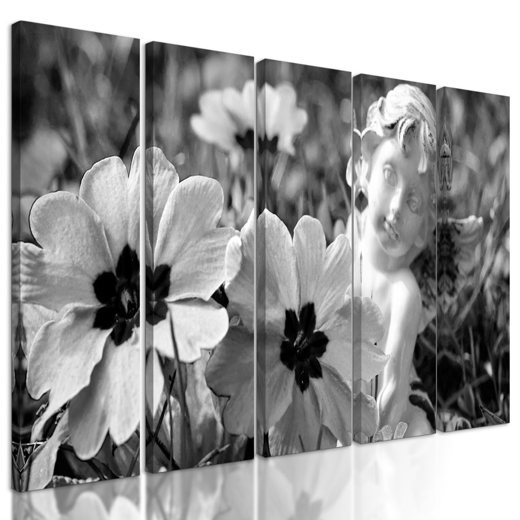 5-dielny obraz anjel na rozkvitnutej lúke v čiernobielom prevedení
