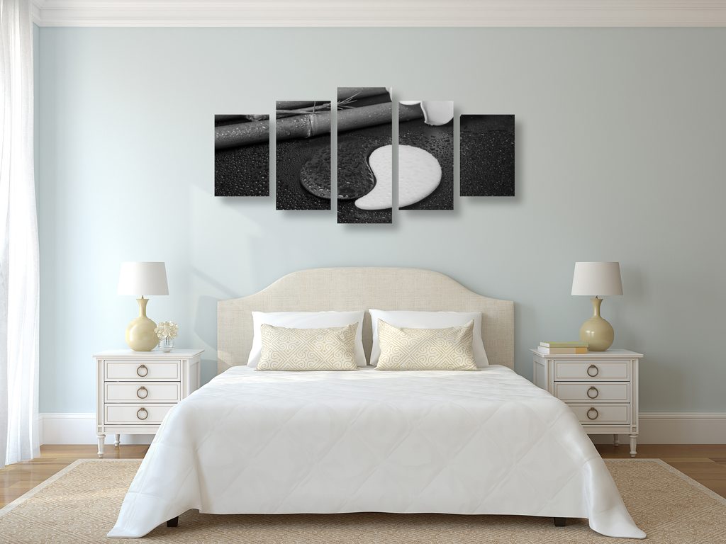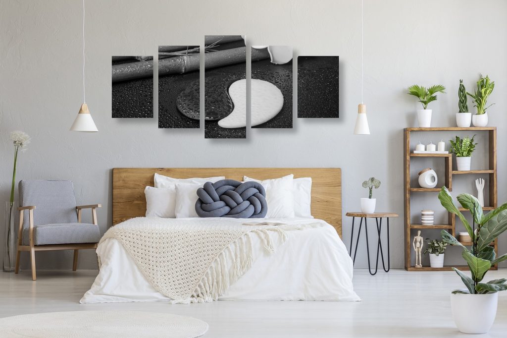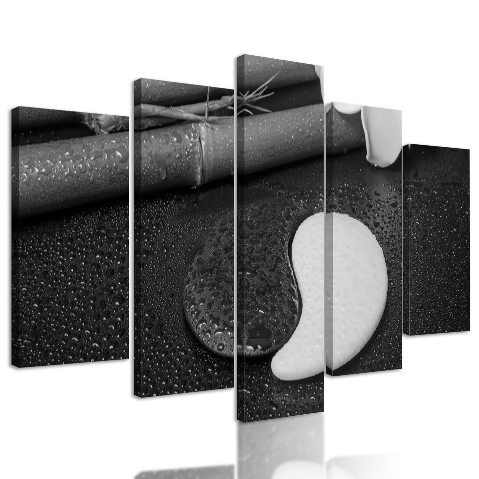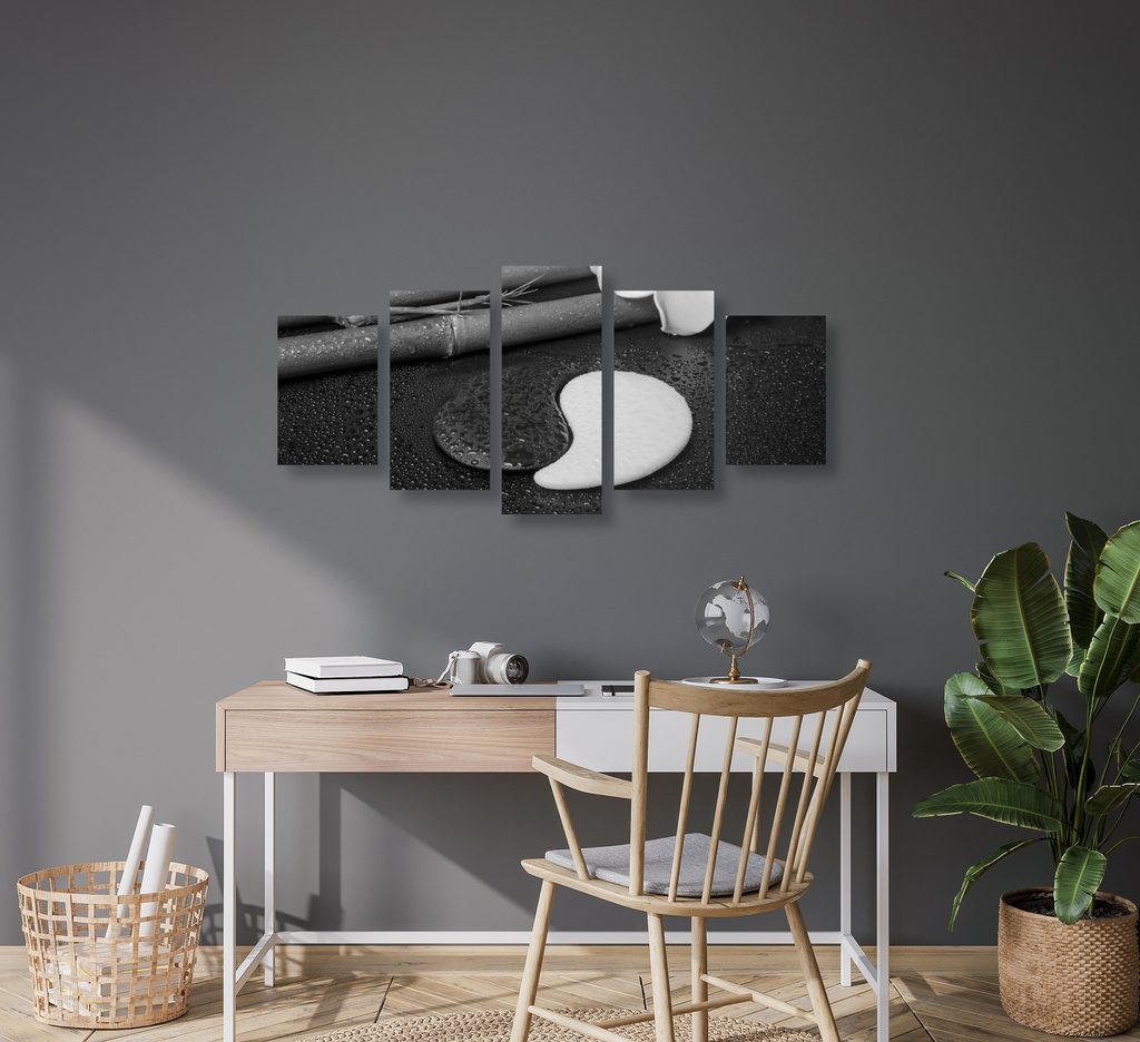 5-dielny obraz bambusové zátišie so symbolom Jin a Jang v čiernobielom prevedení