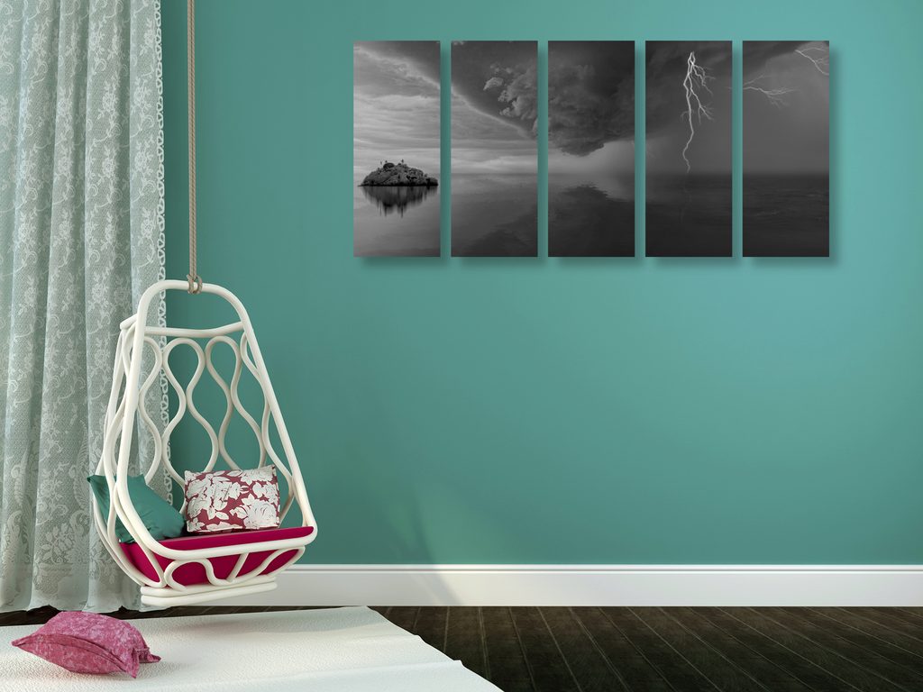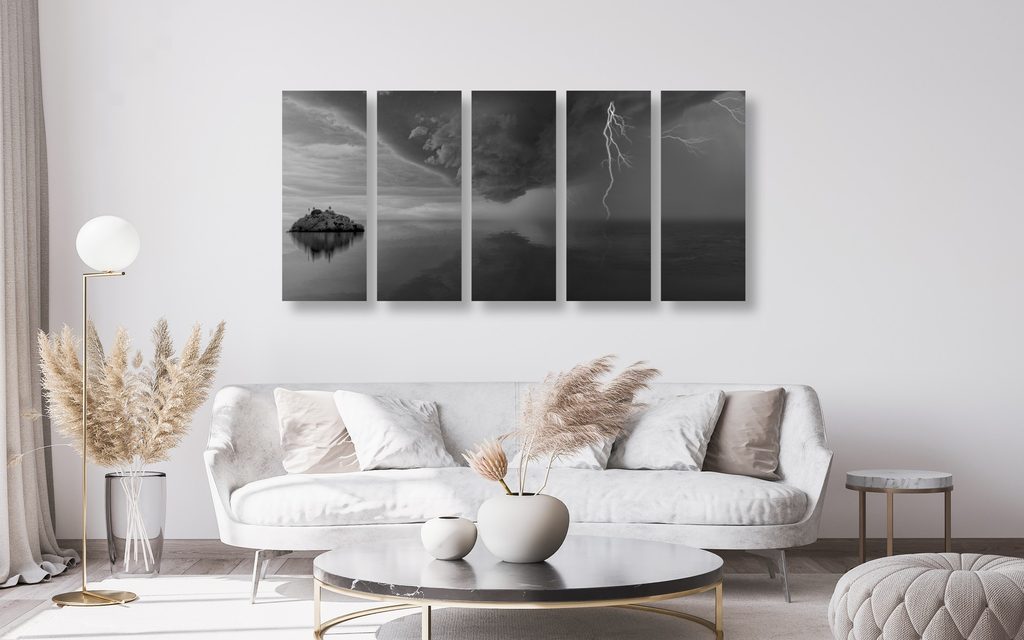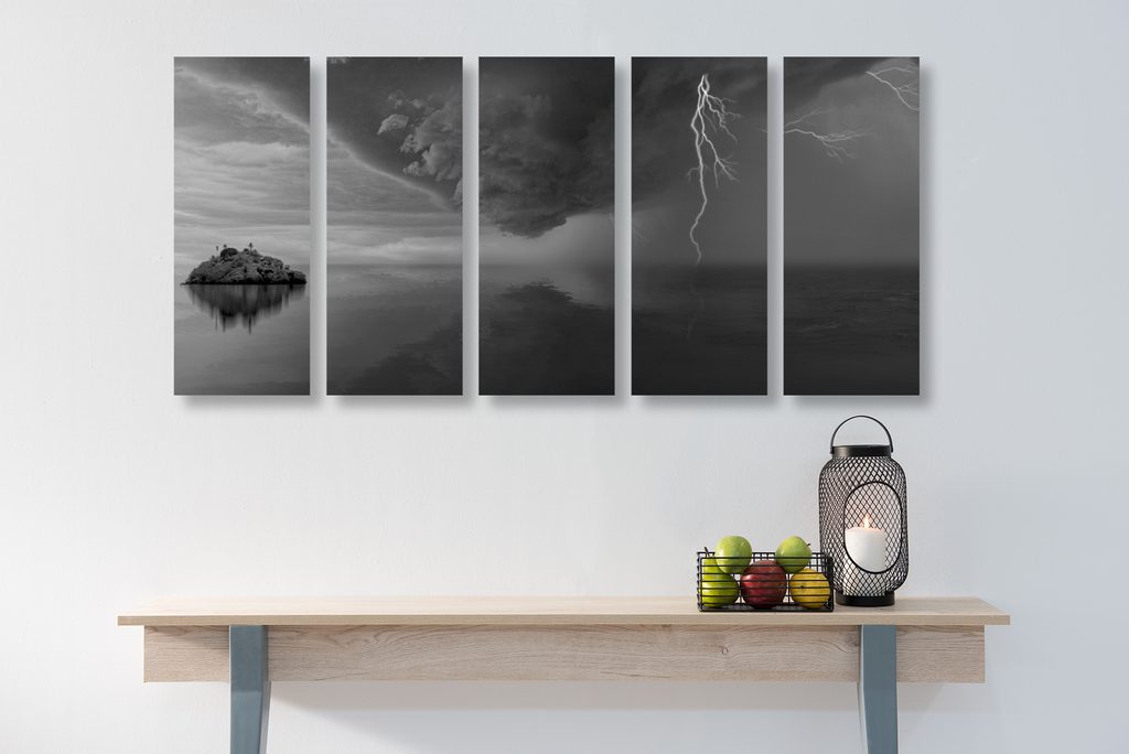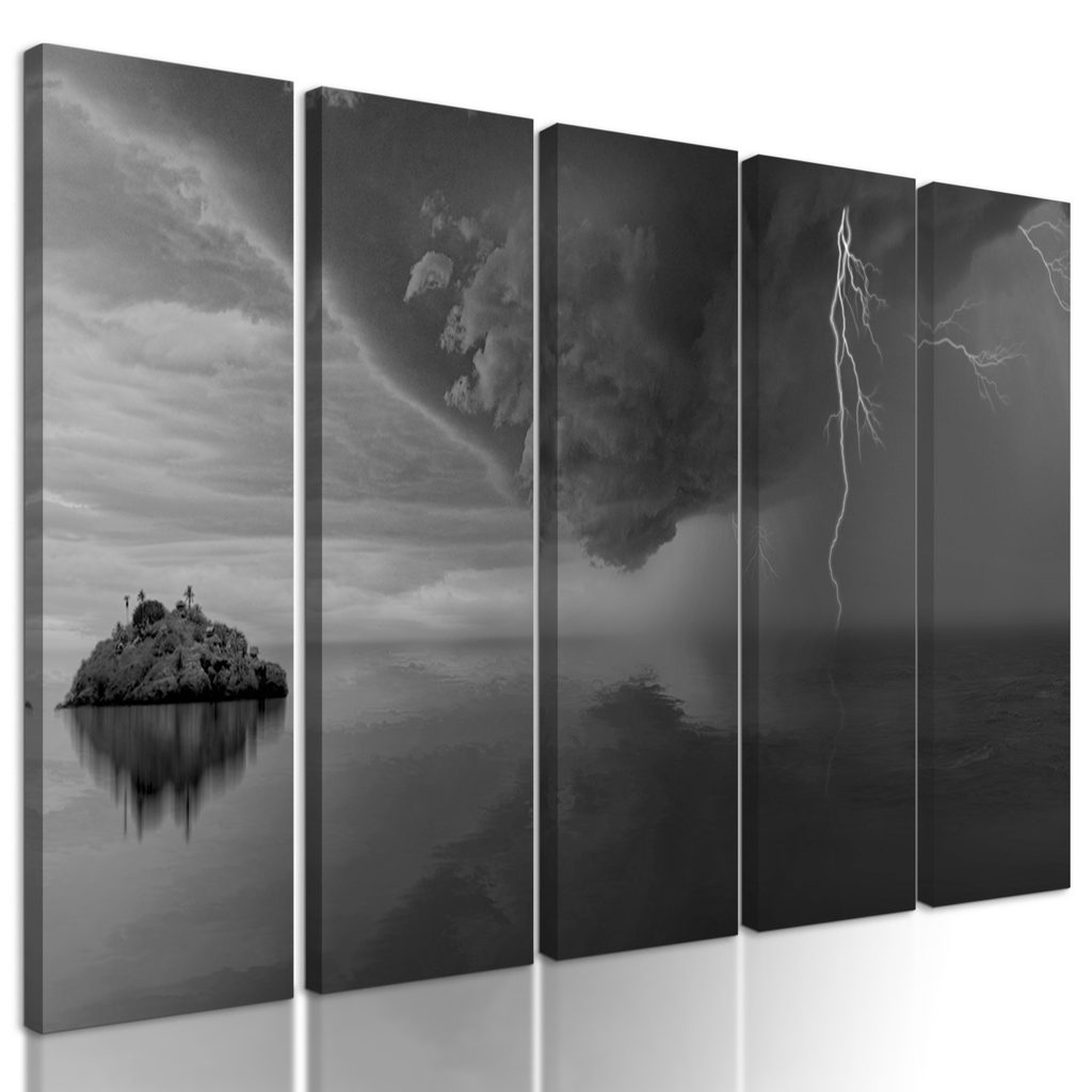 5-dielny obraz búrka valiaca sa na ostrov v čiernobielom prevedení