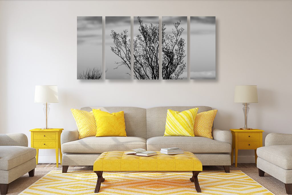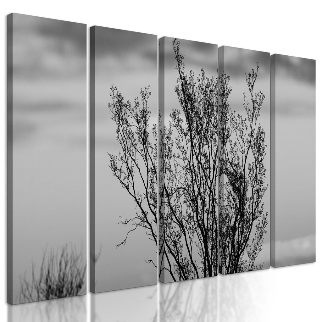 5-dielny obraz bylinky pri západe slnka v čiernobielom prevedení