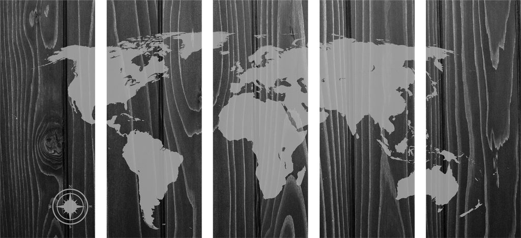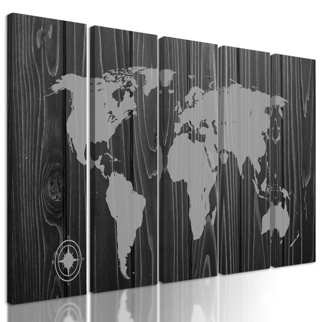 5-dielny obraz čiernobiela mapa sveta na dreve v luxusnom prevedení