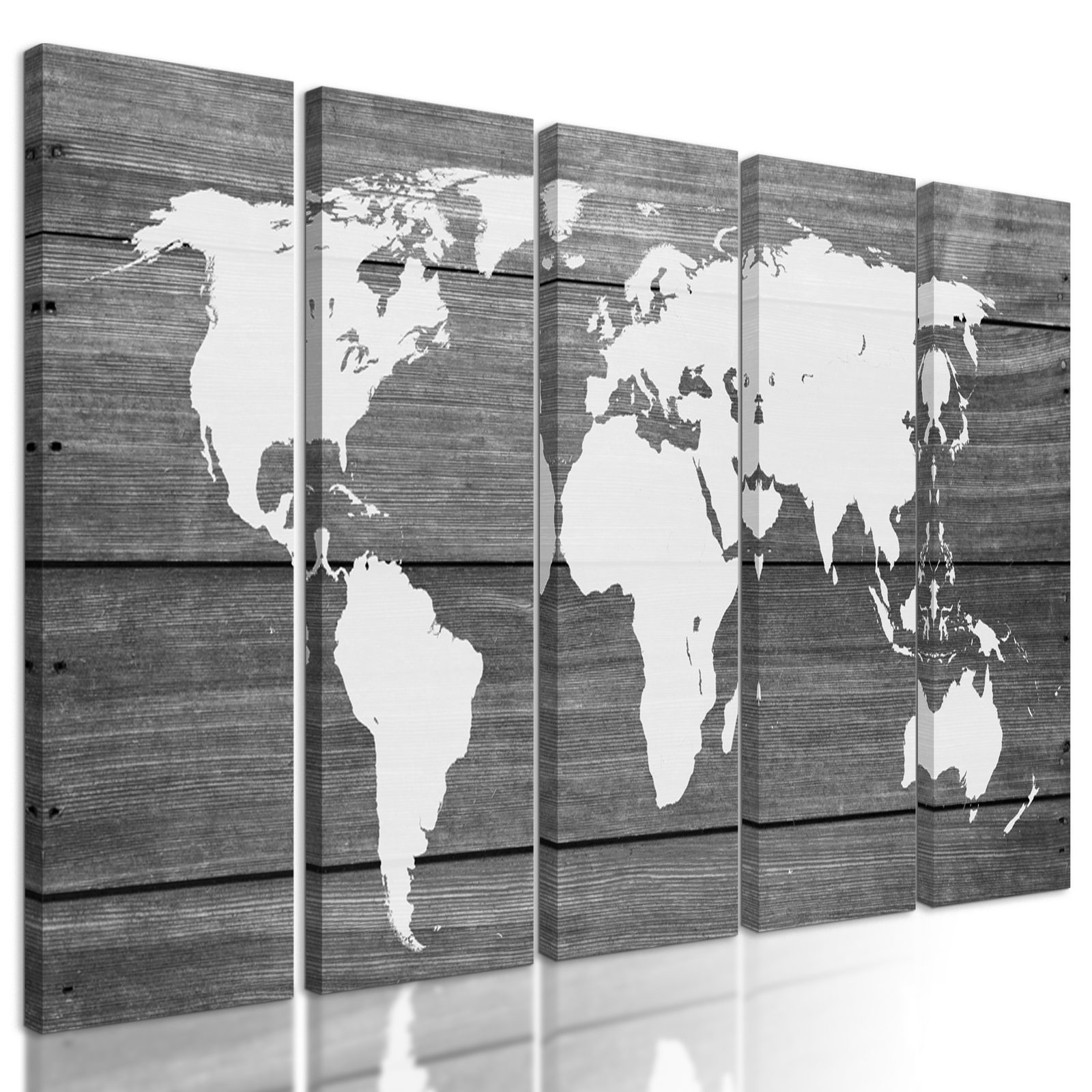 5-dielny obraz čiernobiela moderná mapa sveta na drevenom podklade