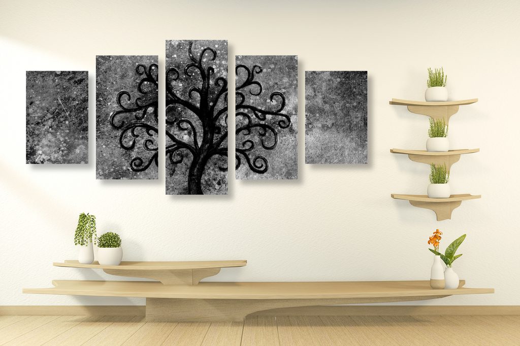 5-dielny obraz čiernobiely strom života v nekonečnom vesmíre