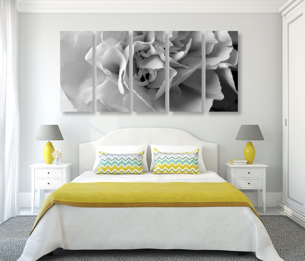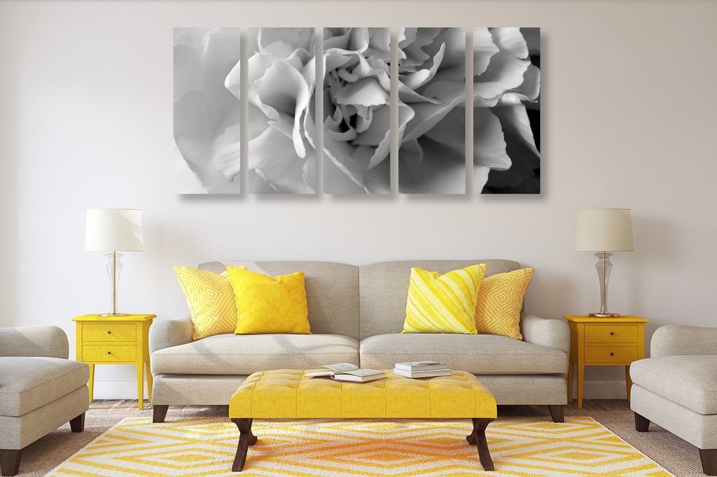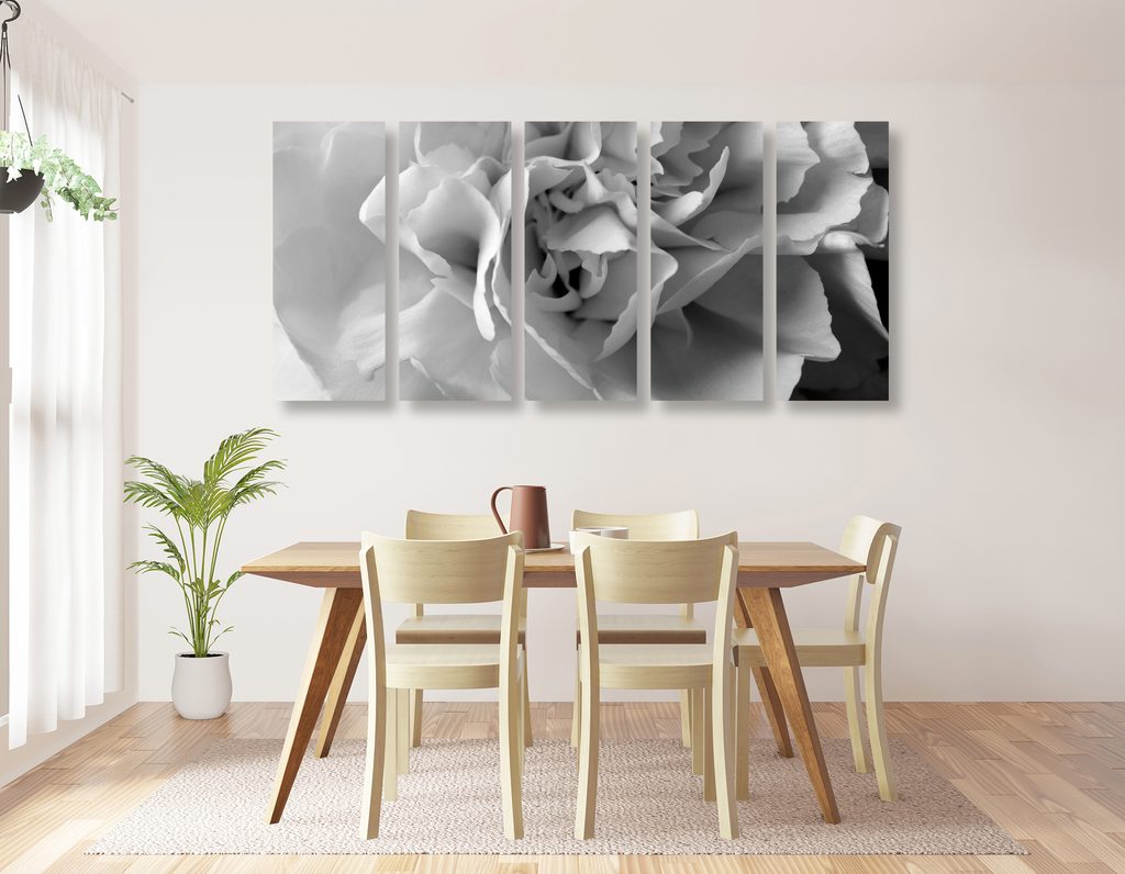 5-dielny obraz detail na kvet karafiátu v čiernobielom prevedení