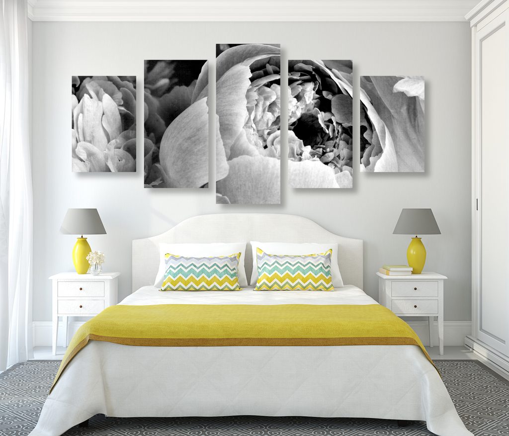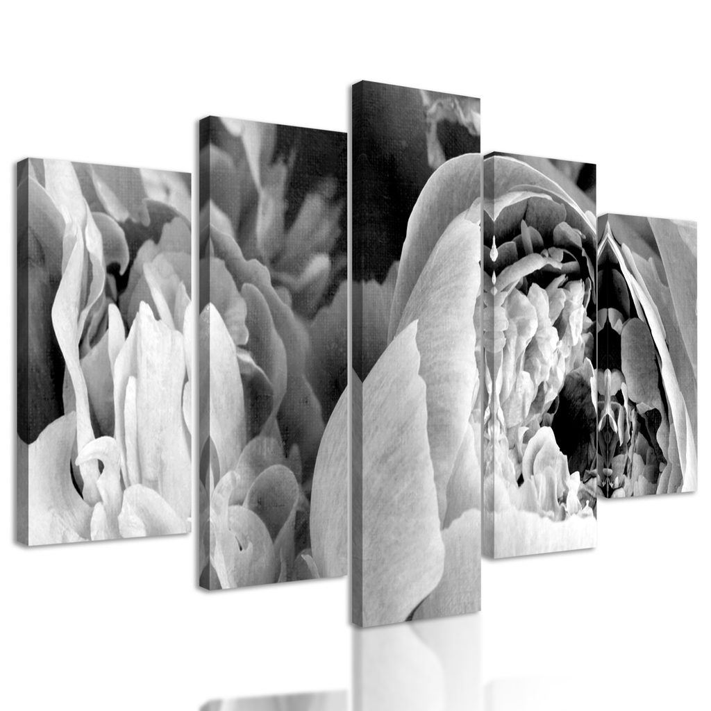 5-dielny obraz detail na kvety v čiernobielom prevedení
