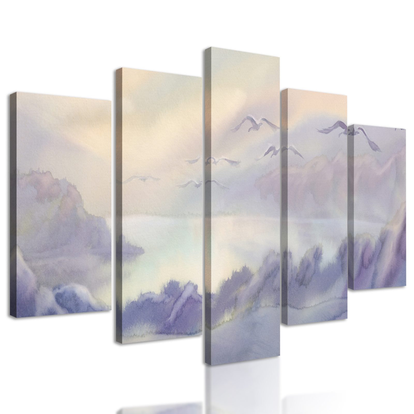 5-dielny obraz hmla nad lesom v čiernobielom prevedení