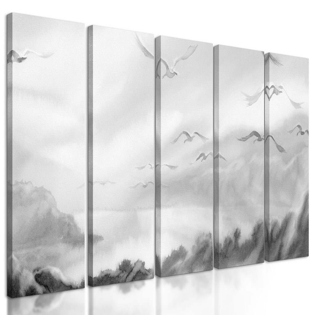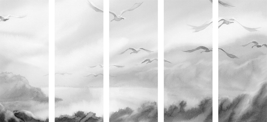 5-dielny obraz divoké čajky v čiernobielom prevedení