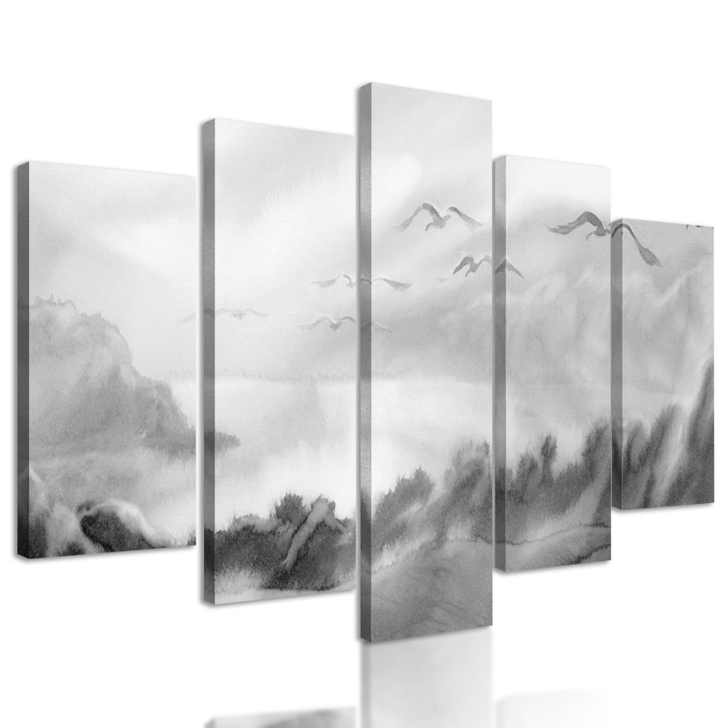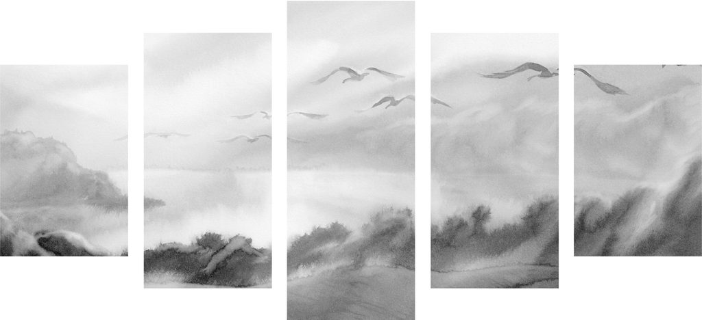 5-dielny obraz divoké čajky v čiernobielom prevedení