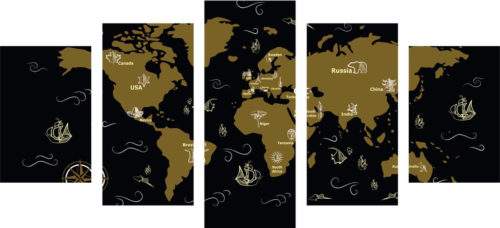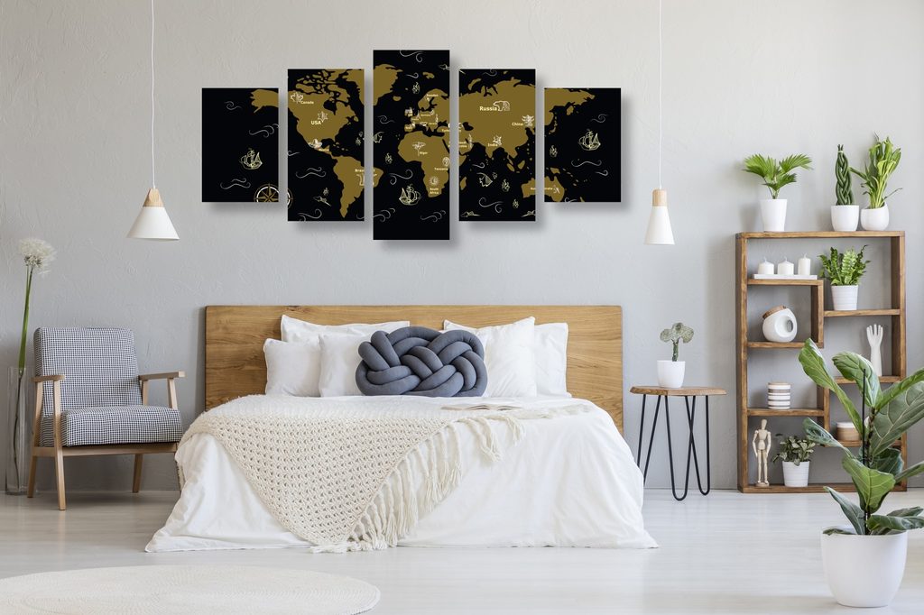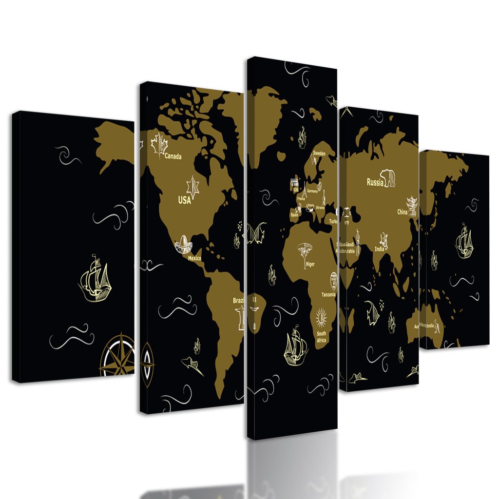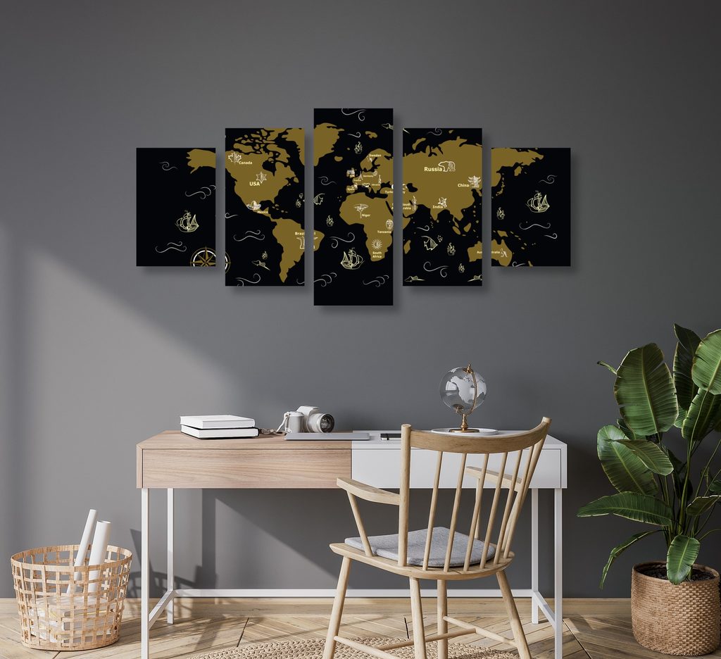 5-dielny obraz luxusná mapa sveta v čiernobielom prevedení