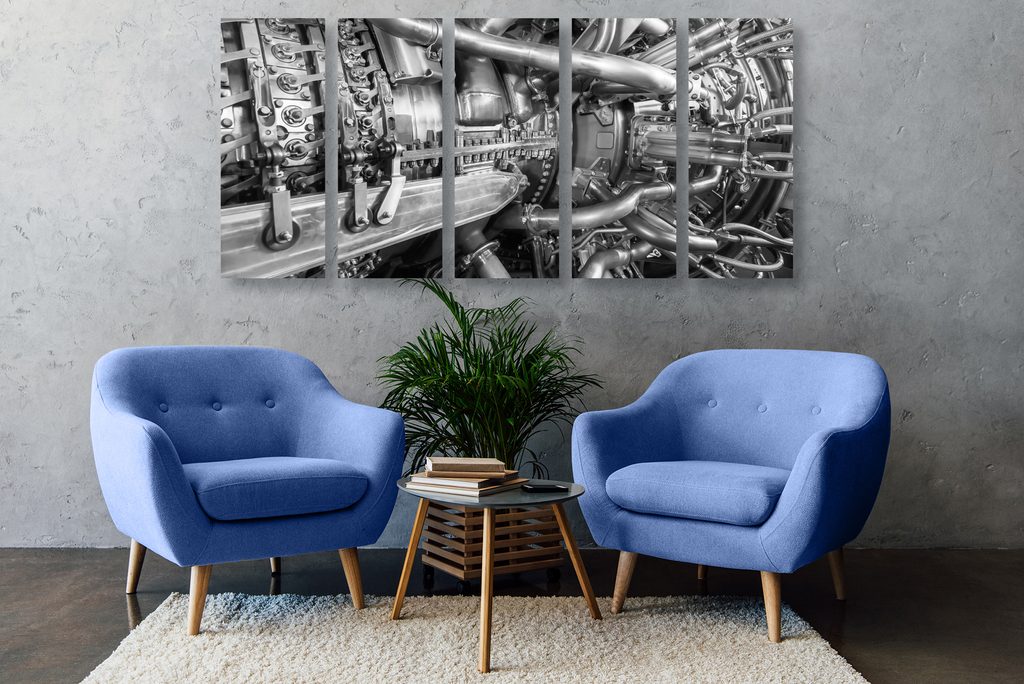 5-dielny obraz dokonale prepracovaný motor turbíny v čiernobielom prevedení