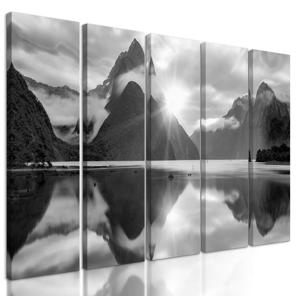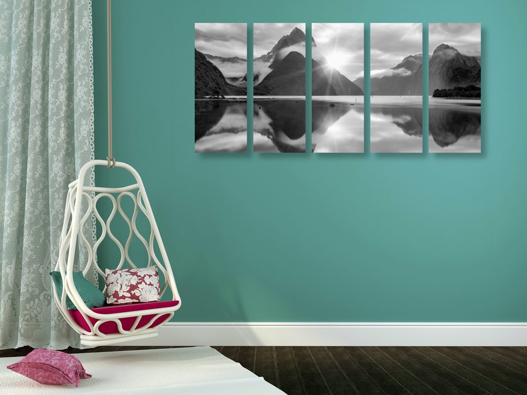 5-dielny obraz dychberúci východ slnka na Novom Zélande v čiernobielom prevedení