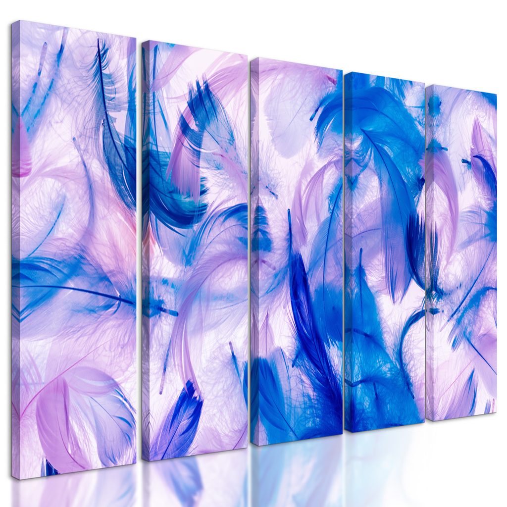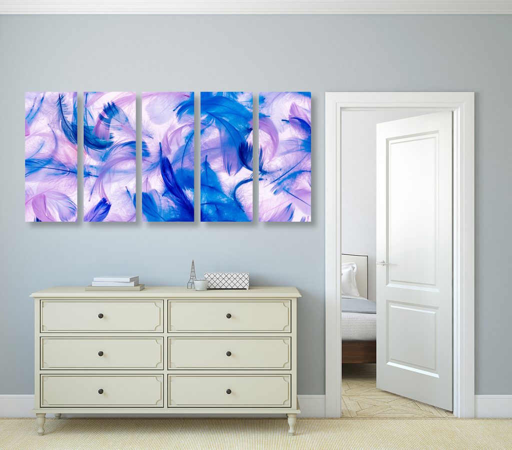 5-dielny obraz fialovo modré abstraktné pierka na bielom pozadí