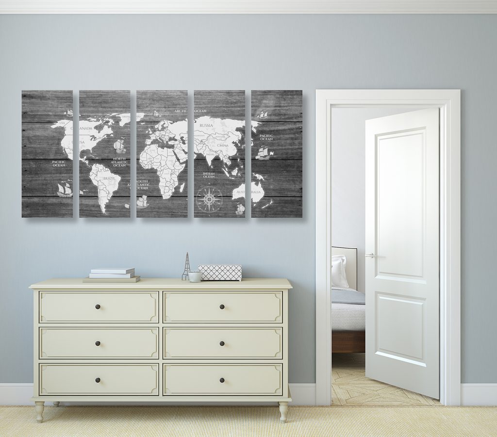 Obraz čiernobiela mapa sveta s dreveným pozadím
