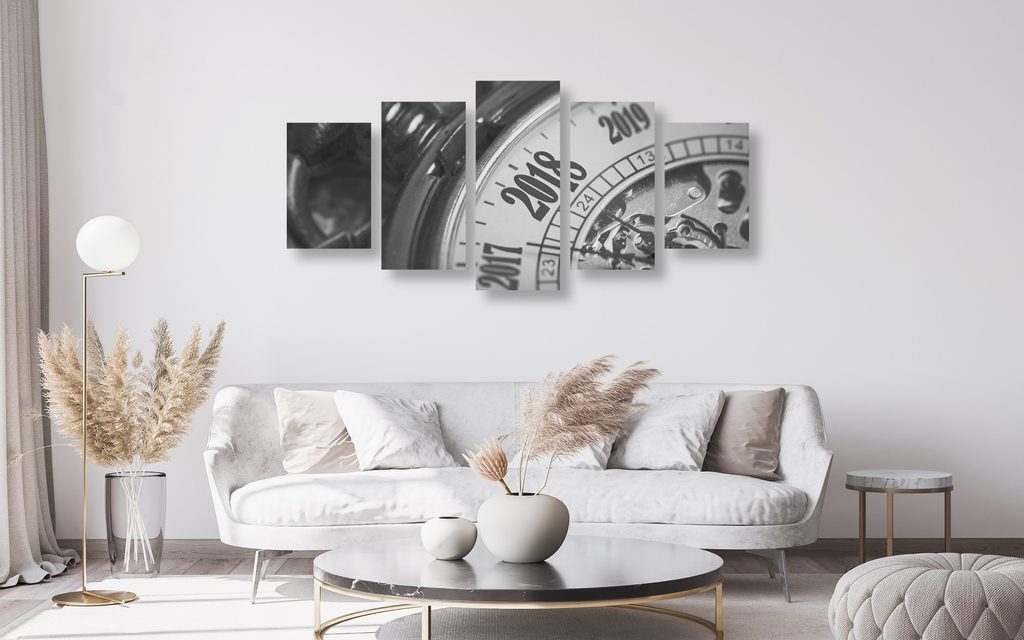 5-dielny obraz historické vreckové hodinky v čiernobielom prevedení
