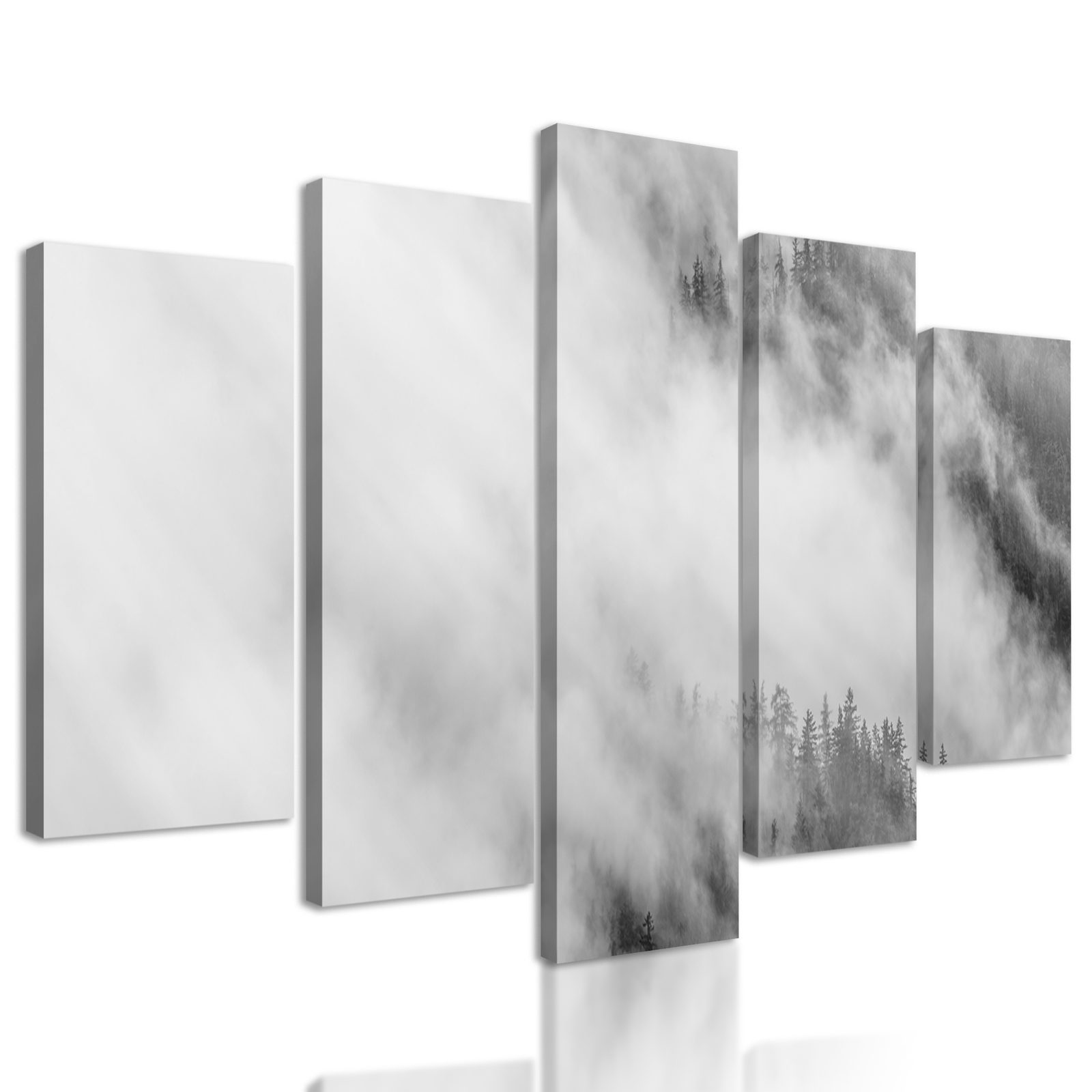 5-dielny obraz hmla nad lesom v čiernobielom prevedení