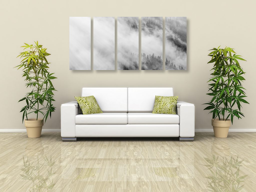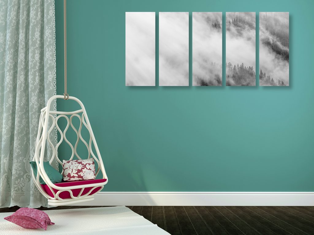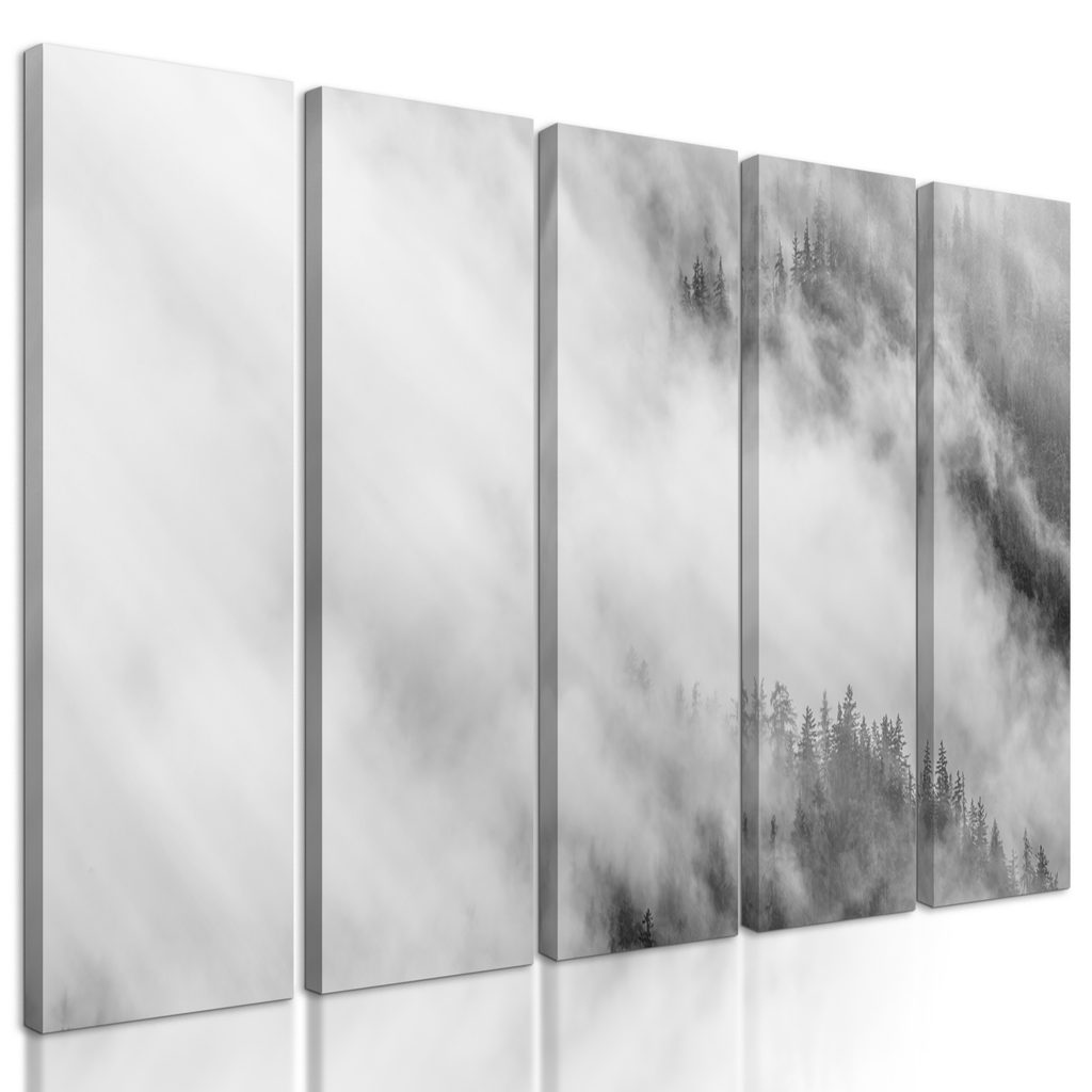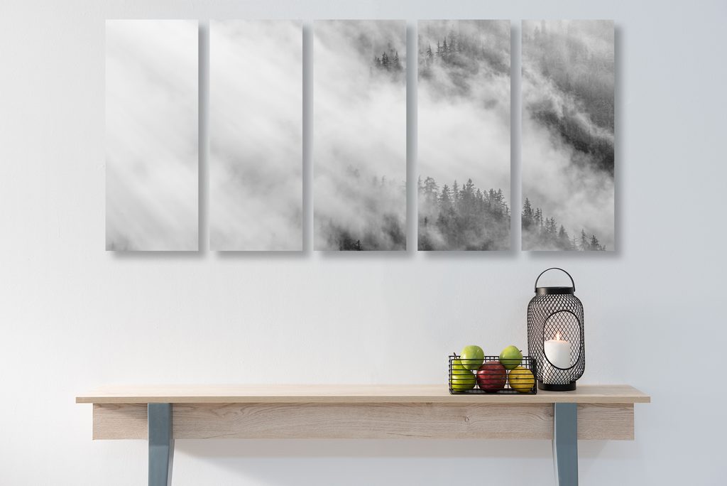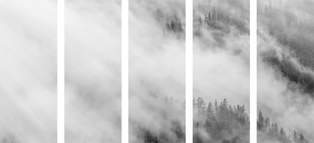 5-dielny obraz hmla nad lesom v čiernobielom prevedení