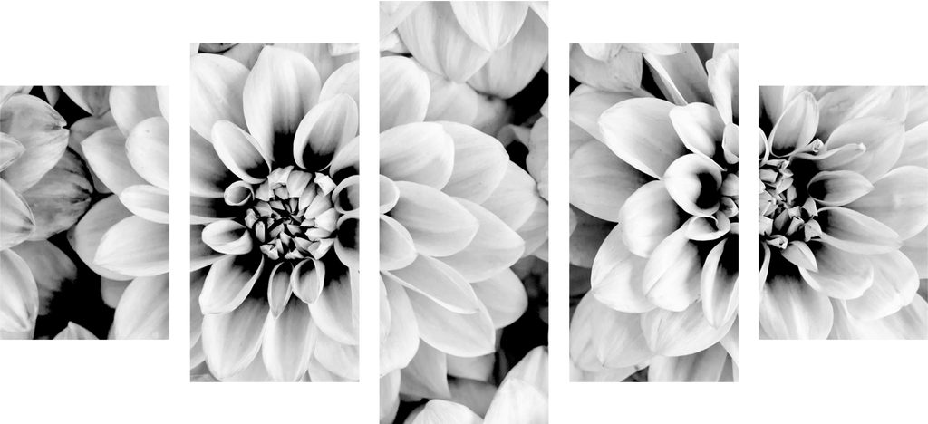 5-dielny obraz jemné rozkvitnuté dálie v čiernobielom prevedení