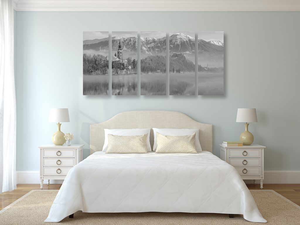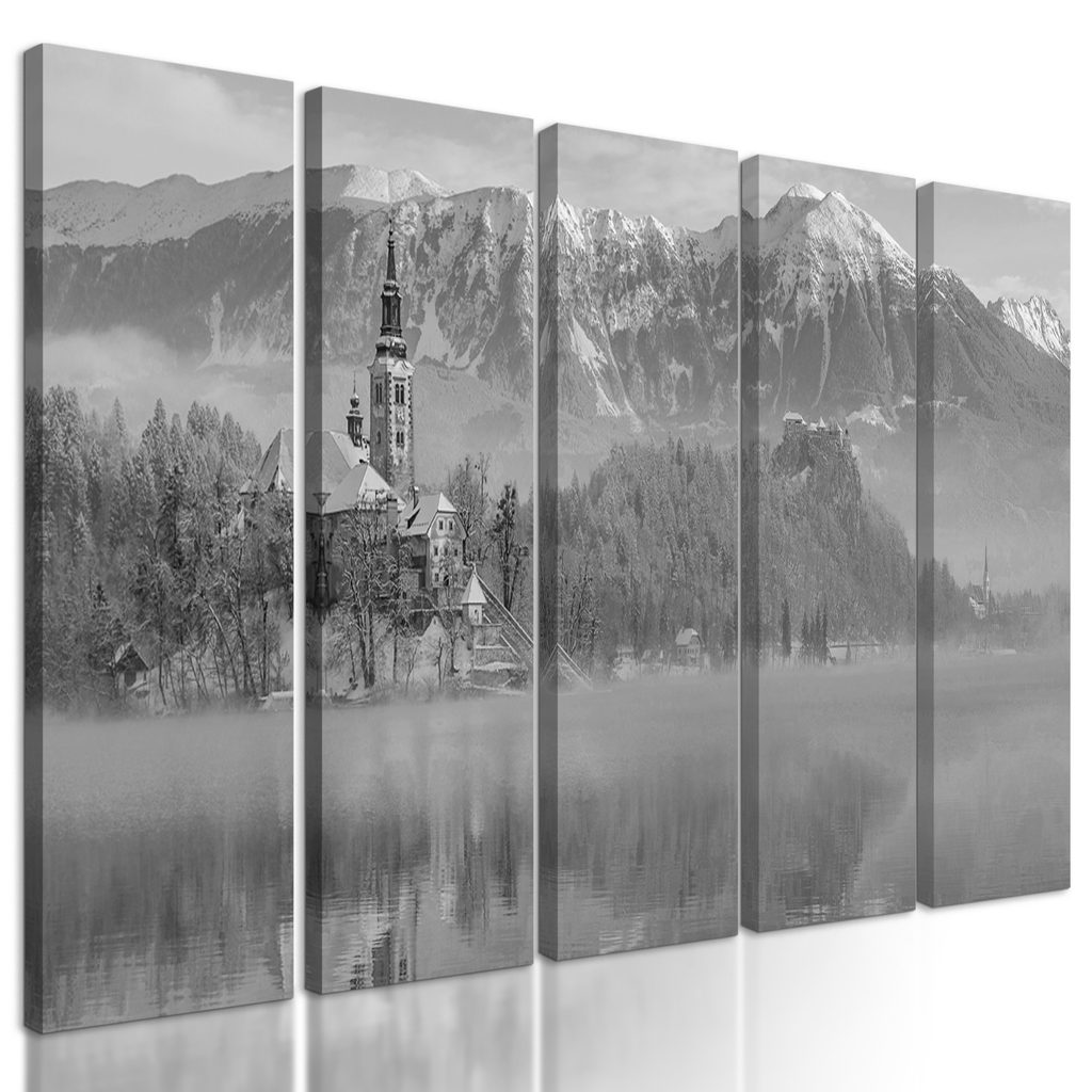 5-dielny obraz kostol na skale v čiernobielom prevedení
