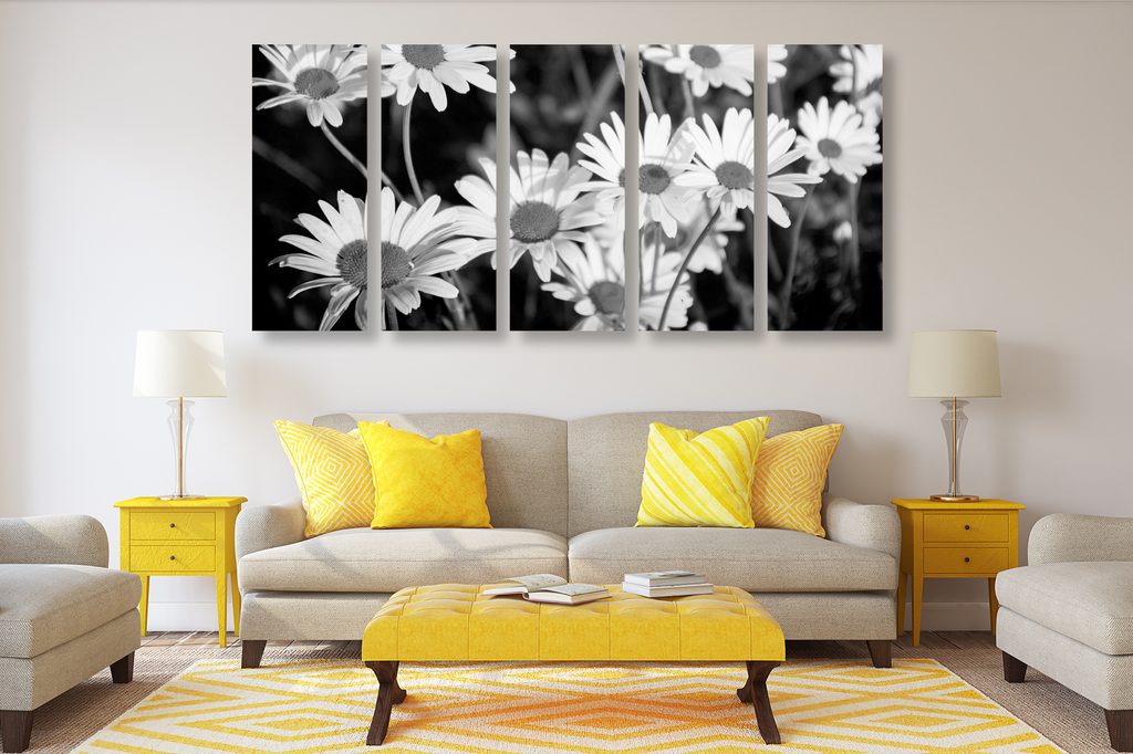 5-dielny obraz krása rozkvitnutých sedmokrások v čiernobielom prevedení