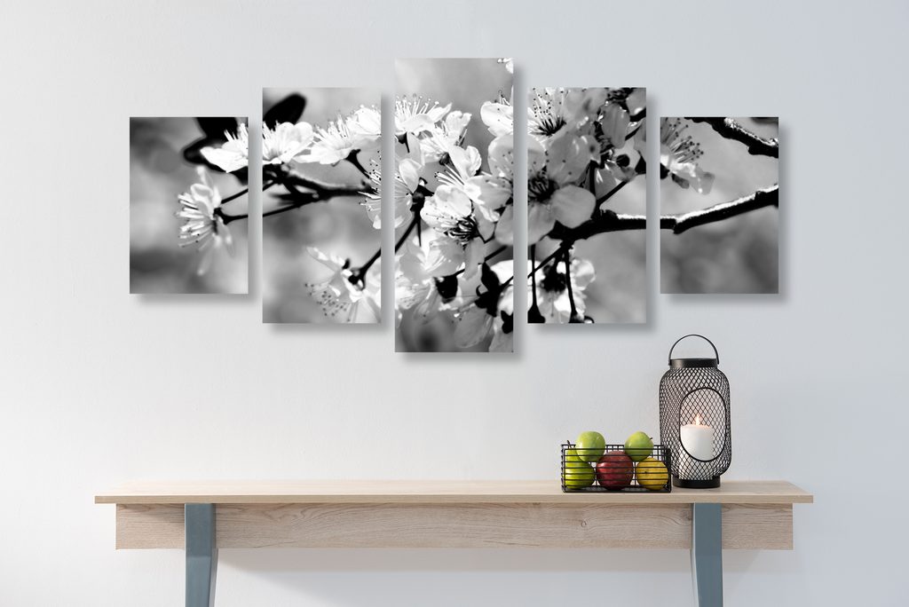 5-dielny obraz krásny kvet v čiernobielom prevedení