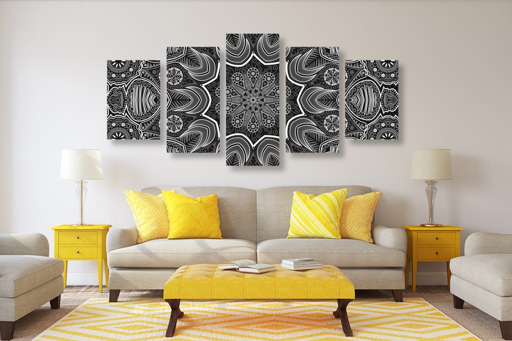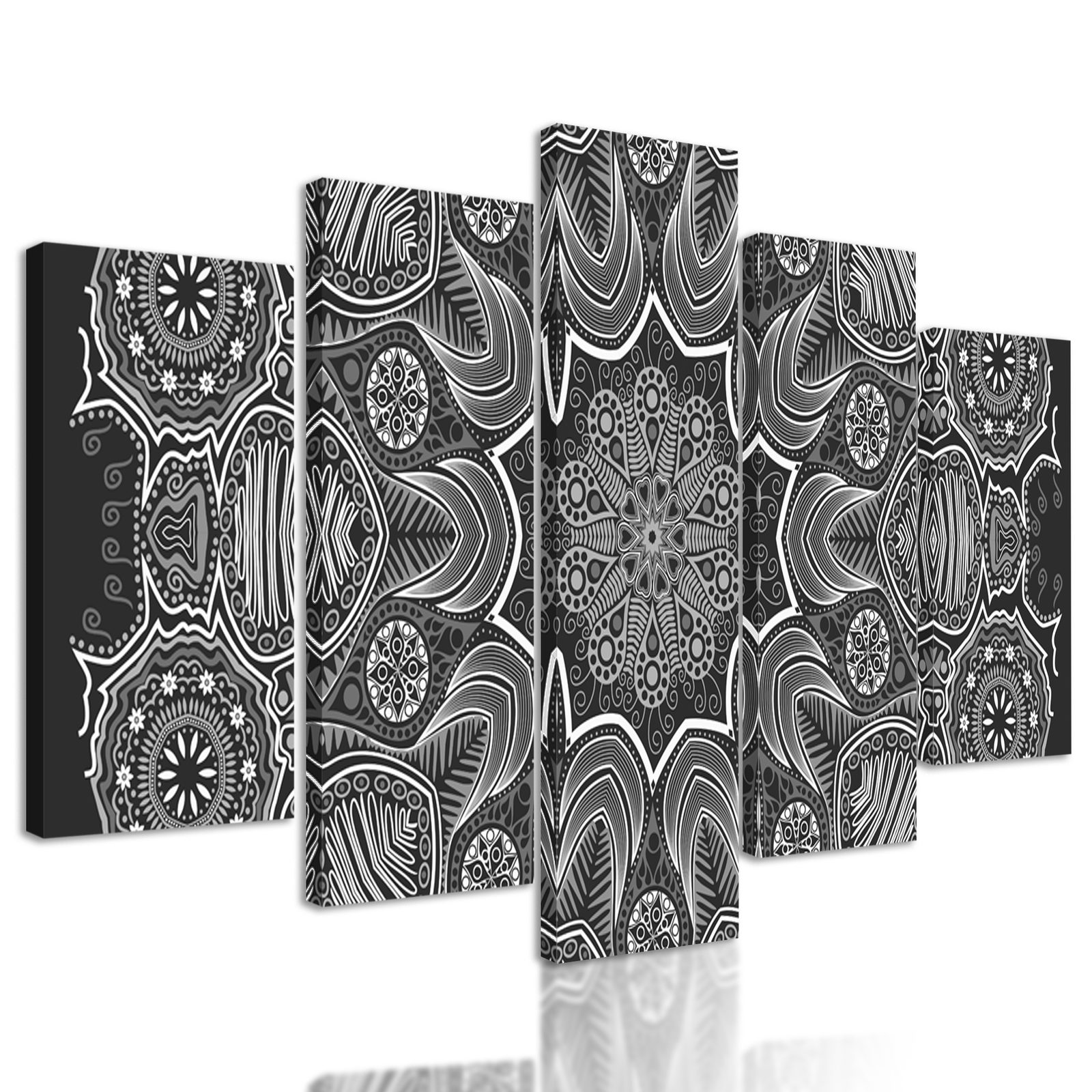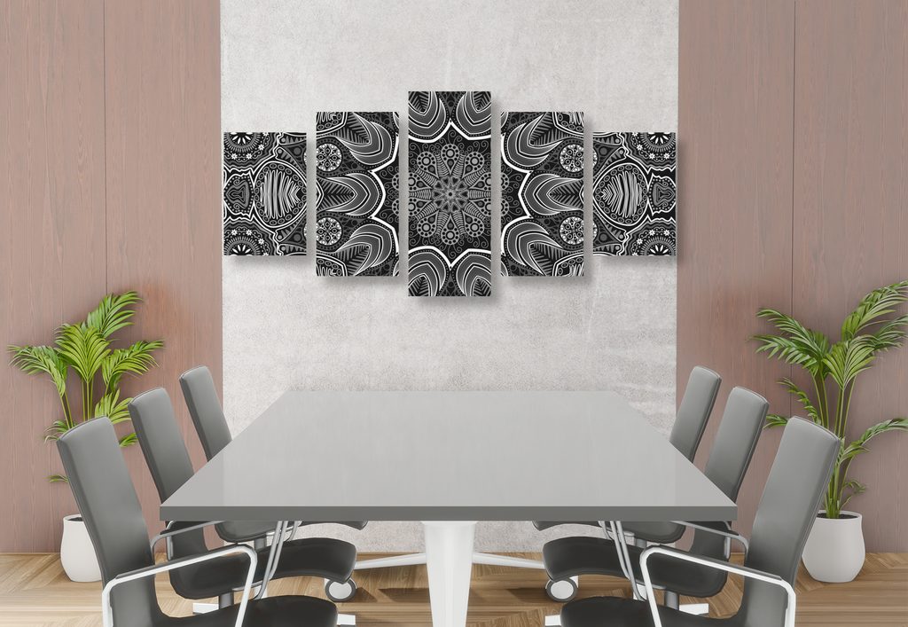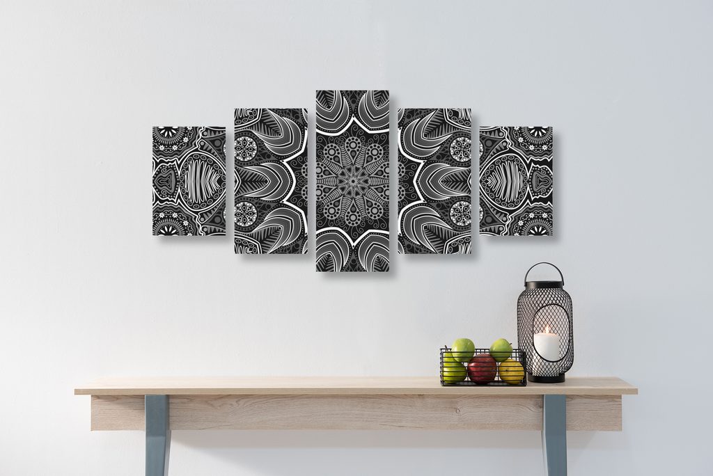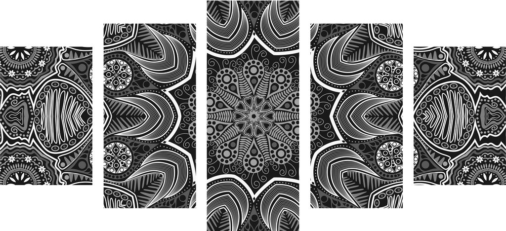 5-dielny obraz kvetinová Mandala v čiernobielom prevedení