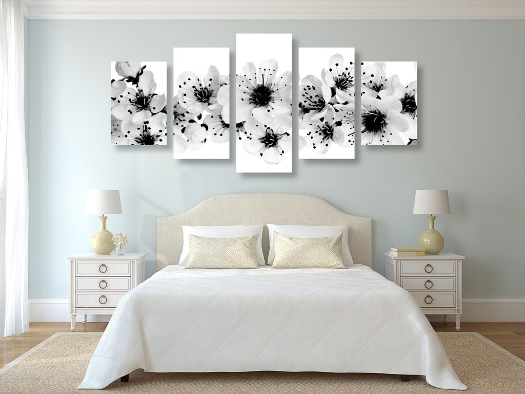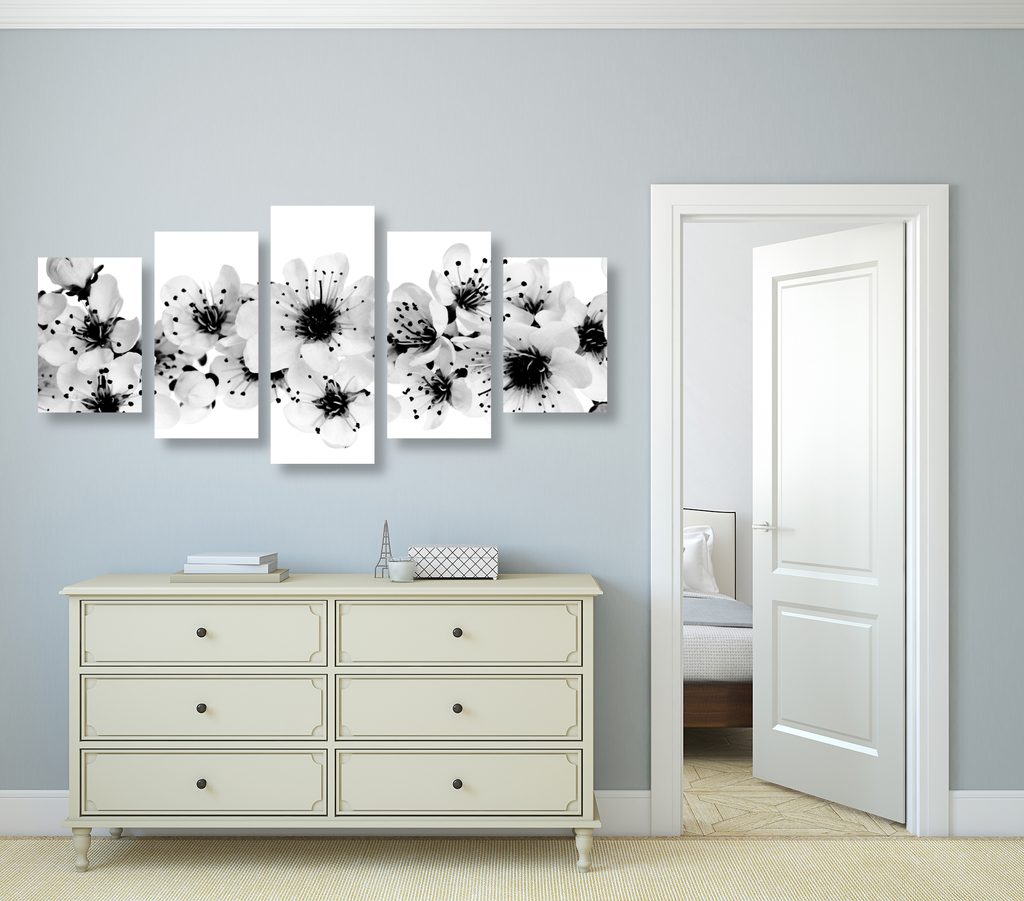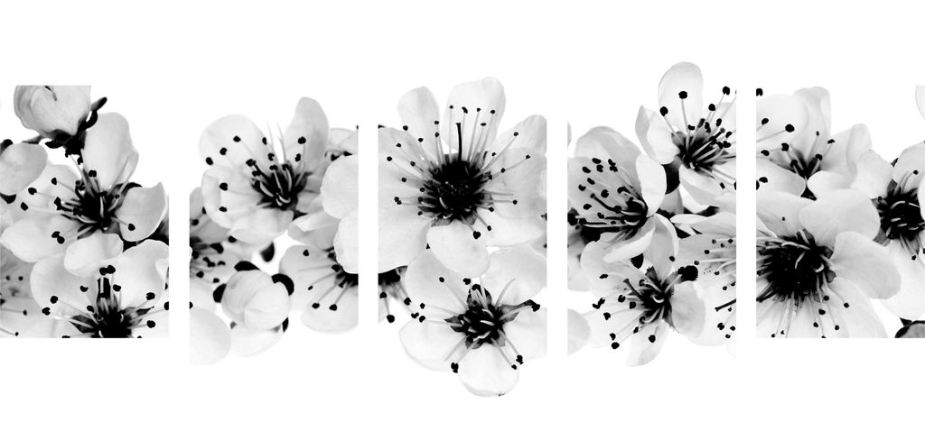 5-dielny obraz kvety čerešne na bielom pozadí v čiernobielom prevedení