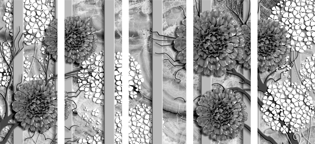 5-dielny obraz kvety gerbery v čiernobielom prevedení