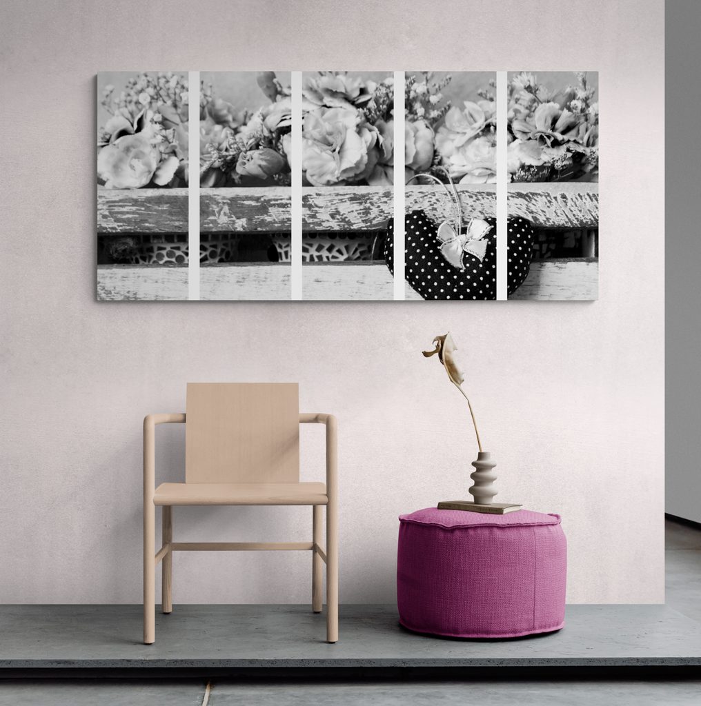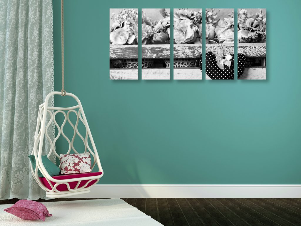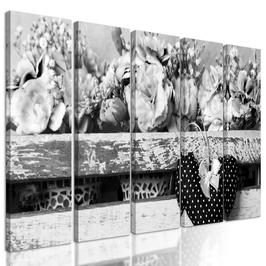 5-dielny obraz kvety karafiátu a srdiečko v čiernobielom prevedení