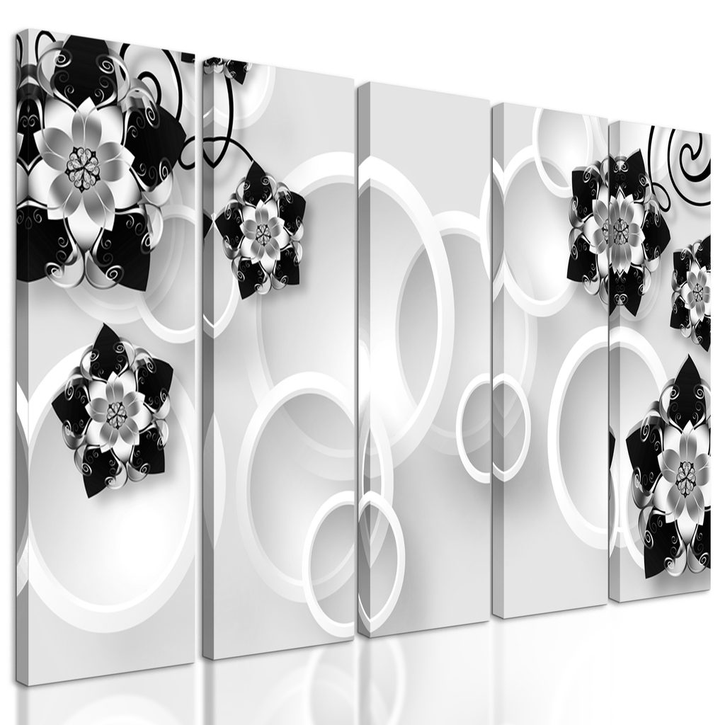 5-dielny obraz kvety na abstraktnom pozadí v čiernobielom pozadí