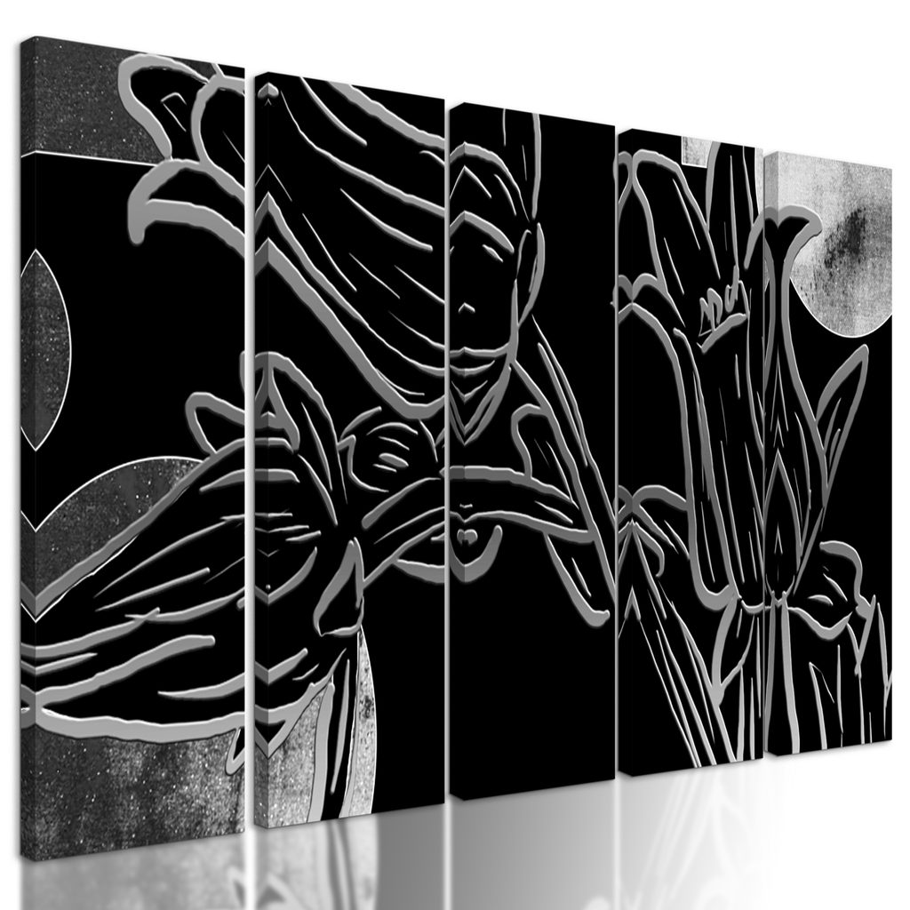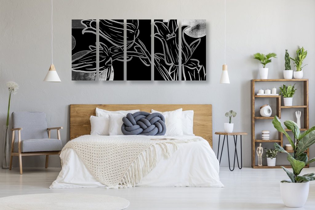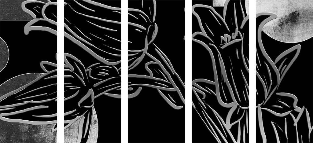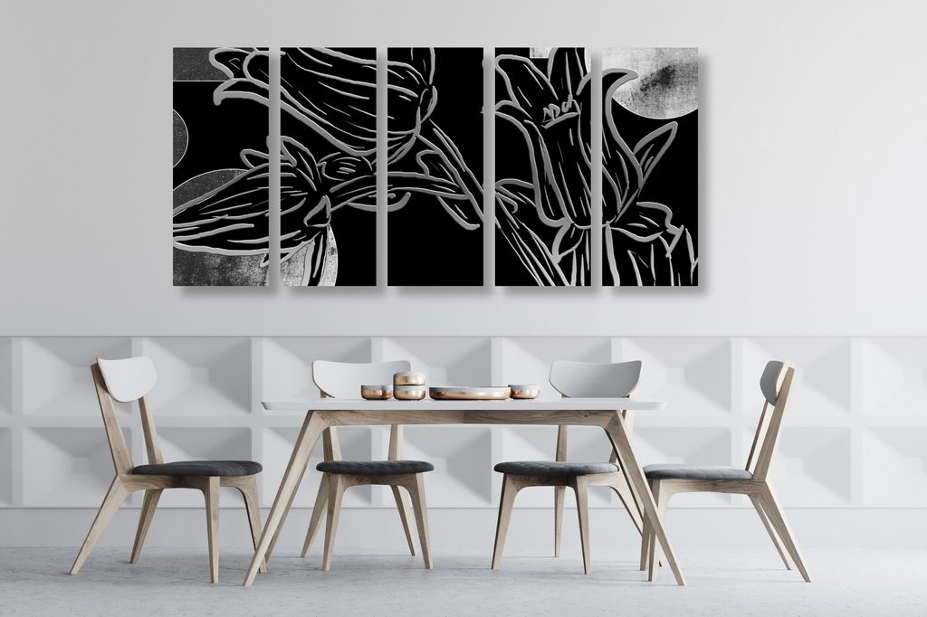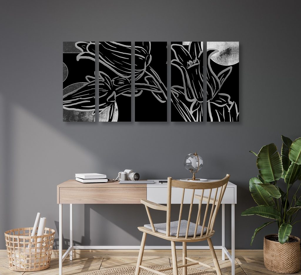 5-dielny obraz kvety v abstraktnom čiernobielom prevedení