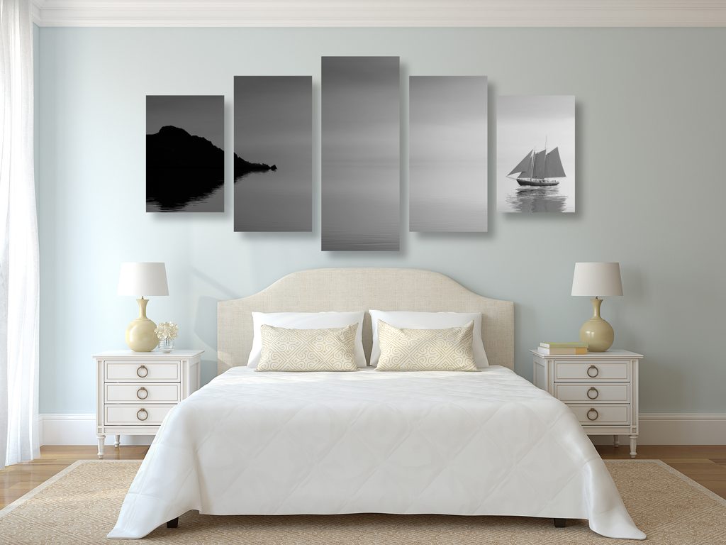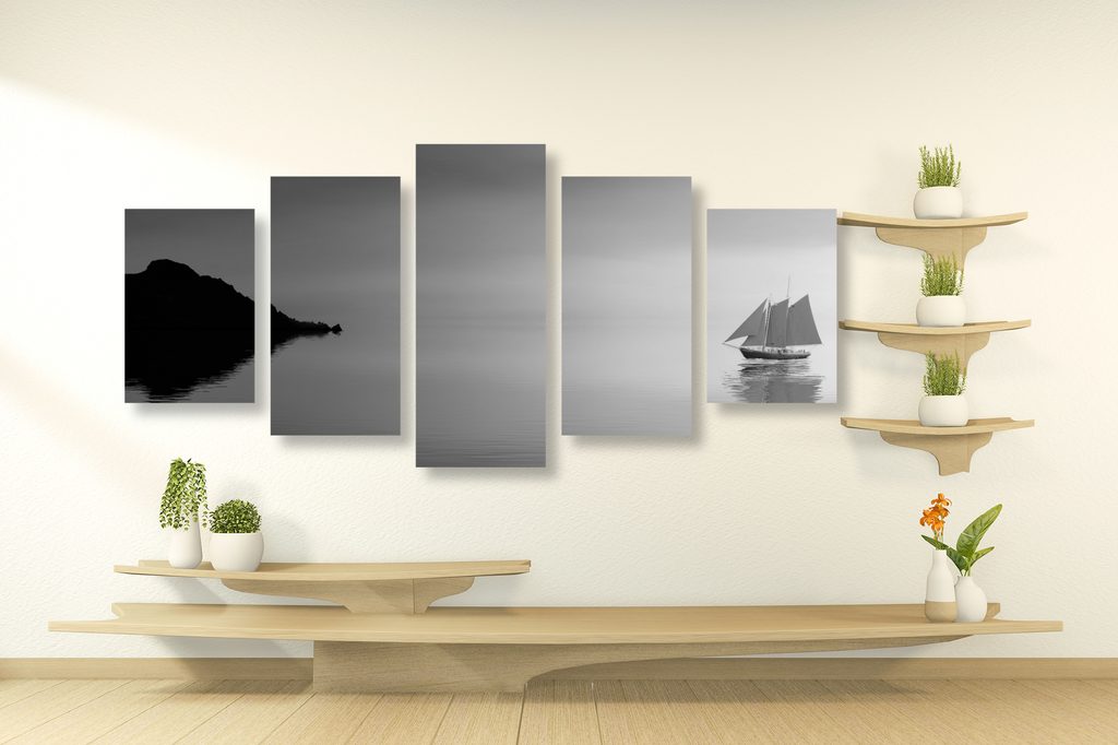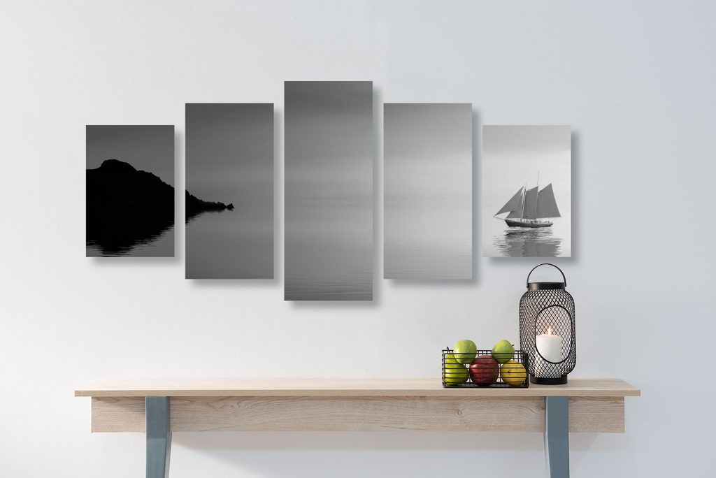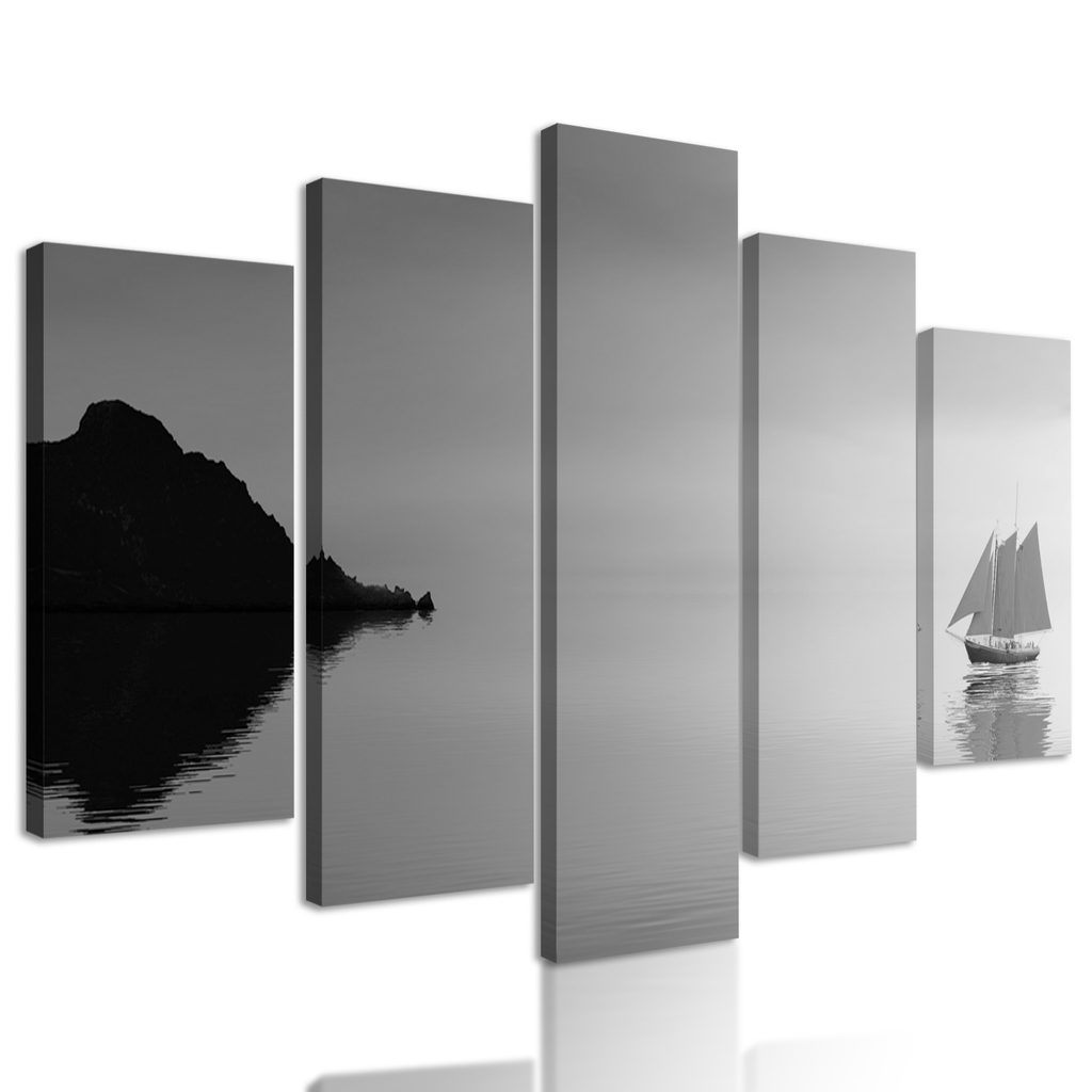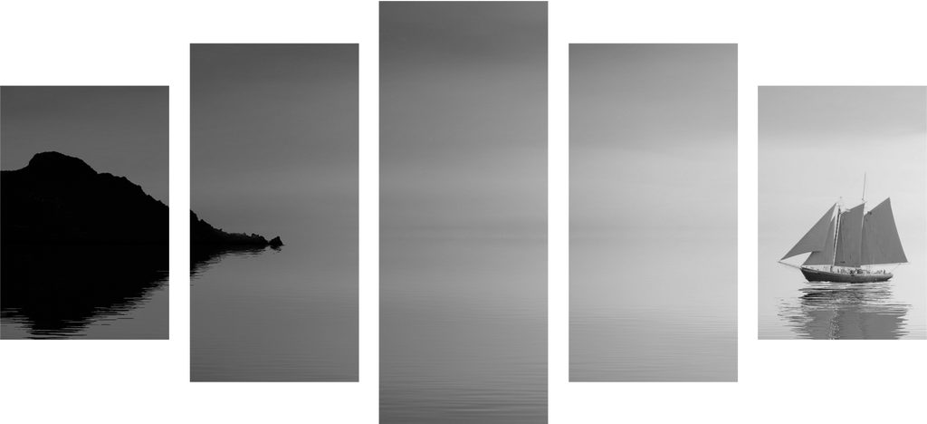 5-dielny obraz loďka na šírom mori v čiernobielom prevedení