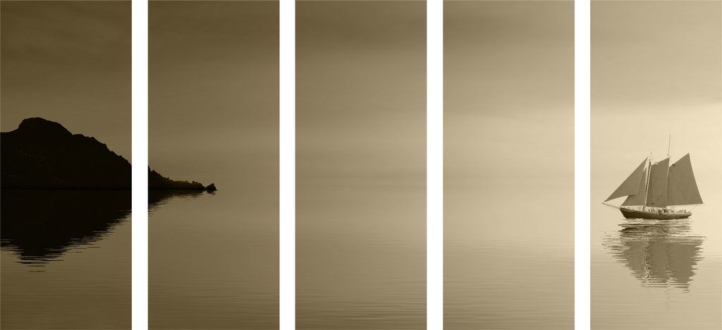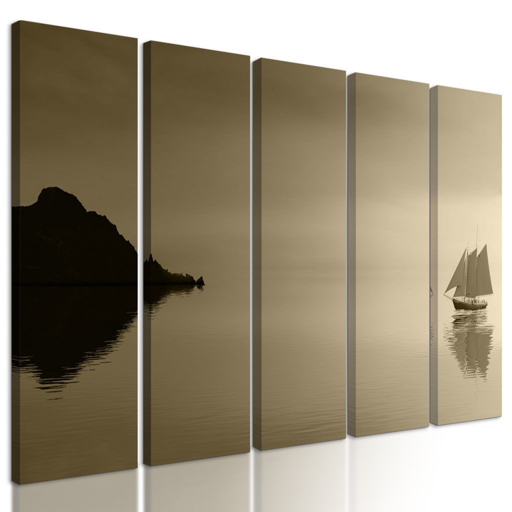 5-dielny obraz loďka na šírom mori v sépiovom prevedení
