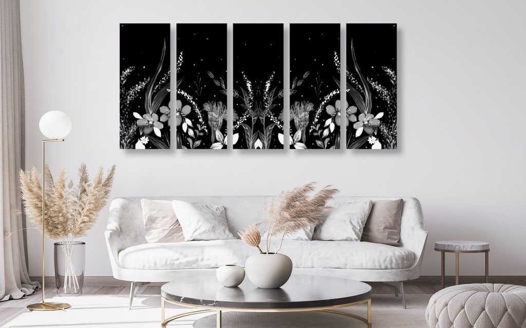 5-dielny obraz lúka plná kvetov v čiernobielom prevedení