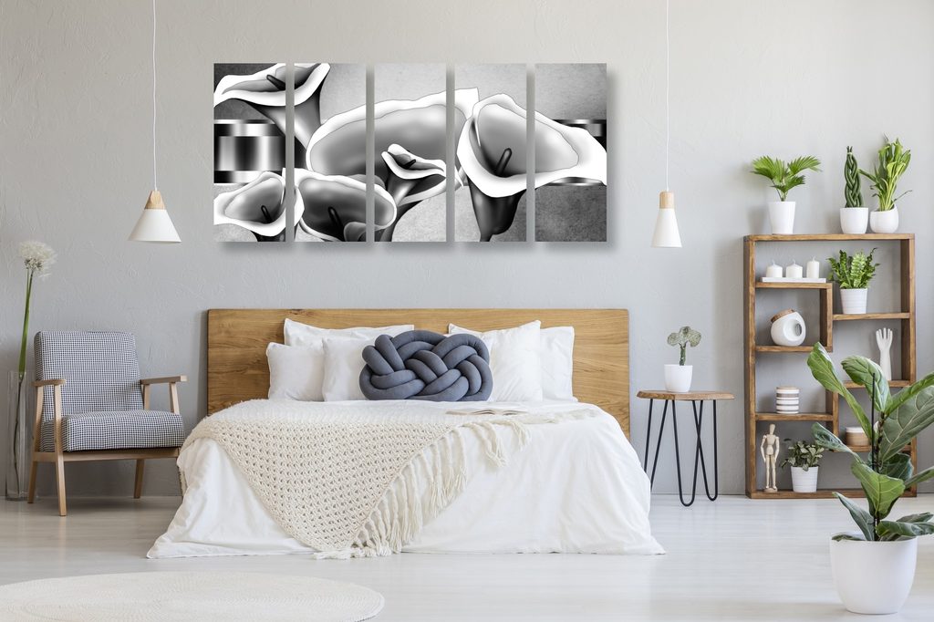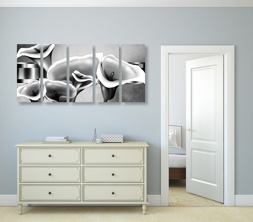 5-dielny obraz luxusné kvety kaly v čiernobielom prevedení