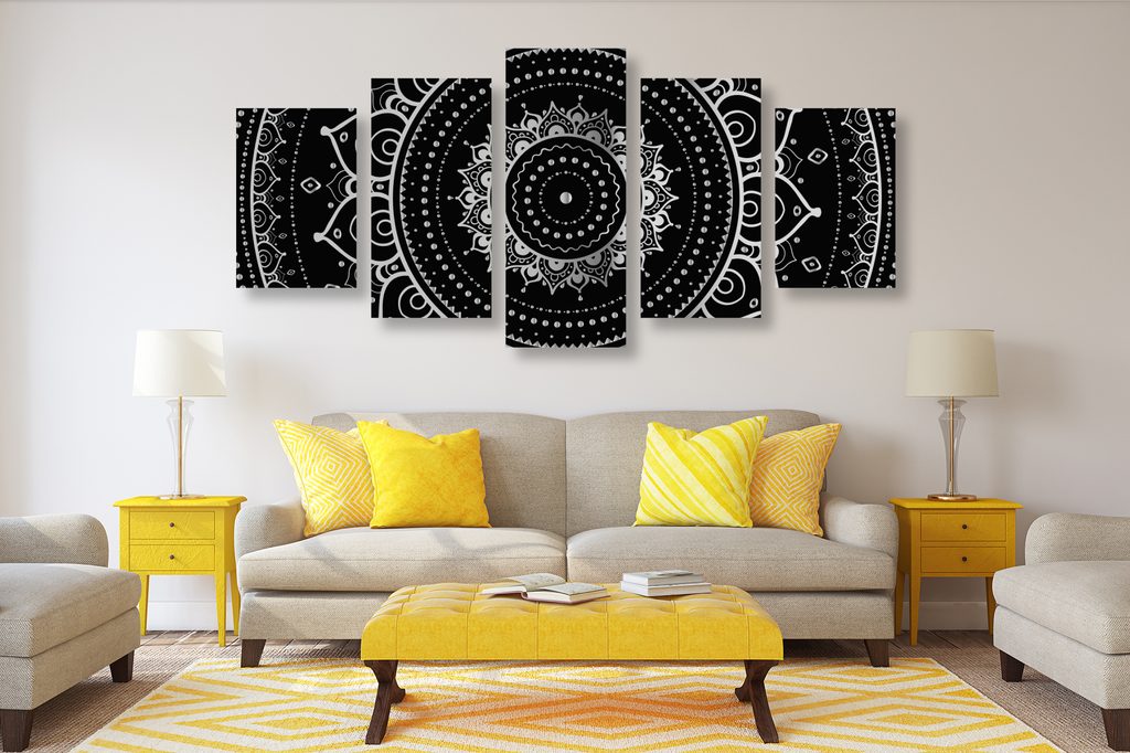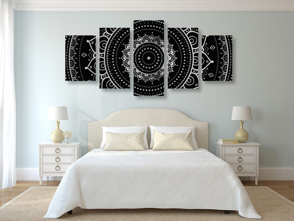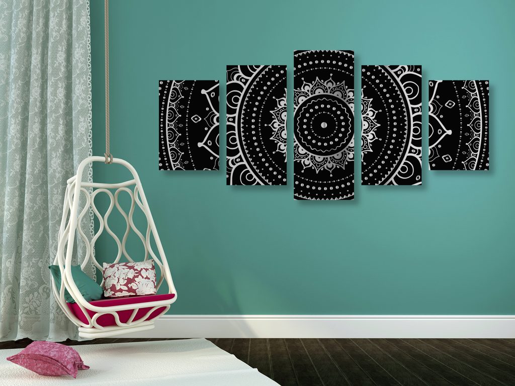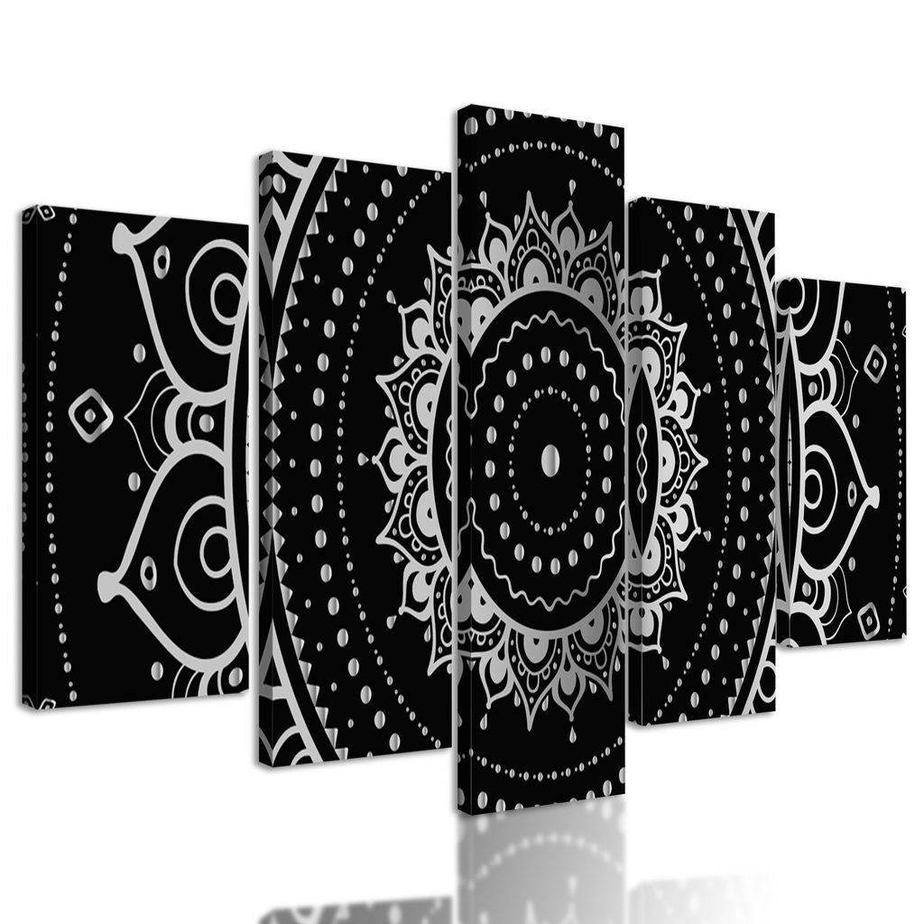 5-dielny obraz magická Mandala v čiernobielom prevedení