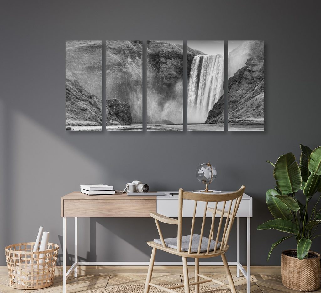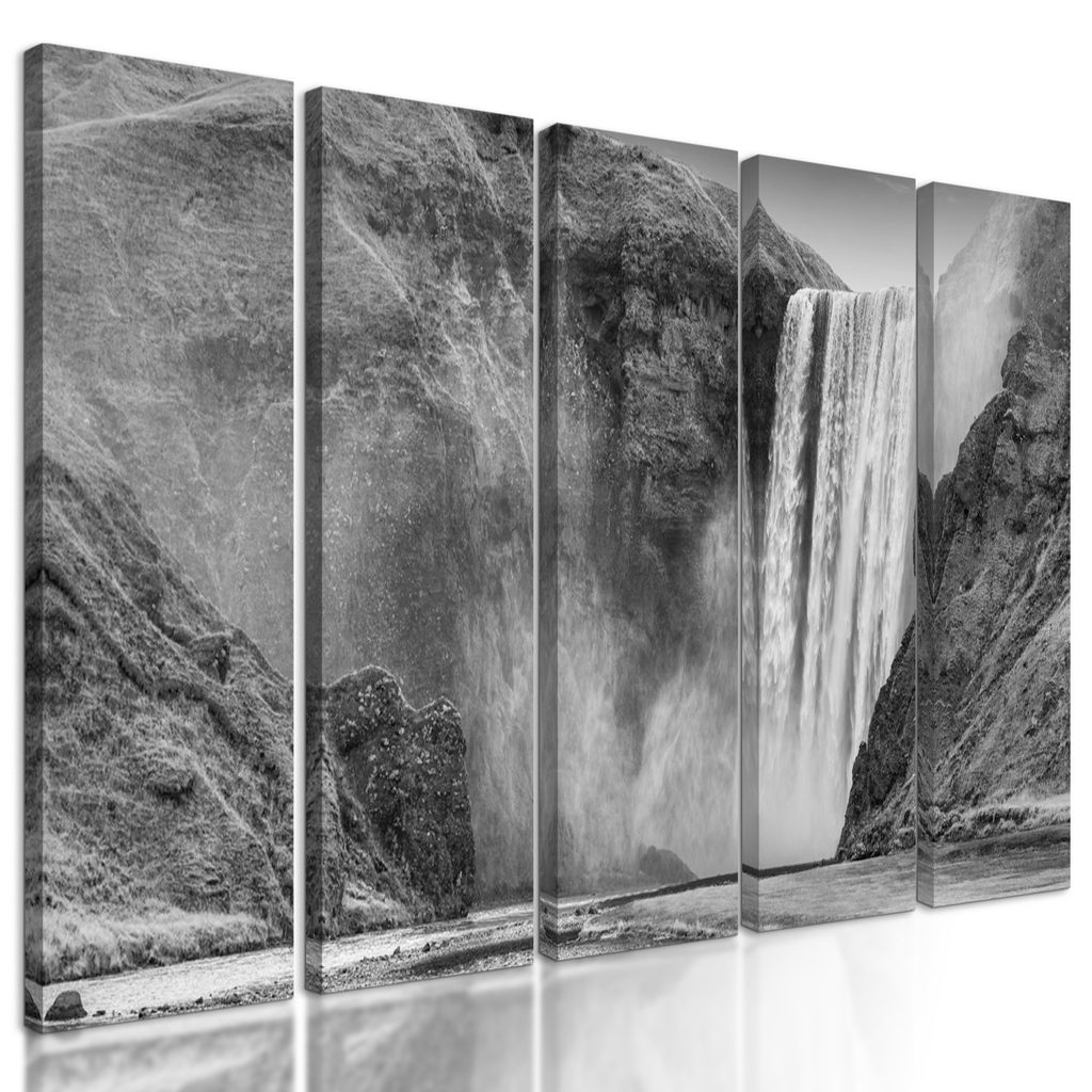 5-dielny obraz majestátny vodopád na Islande v čiernobielom prevedení