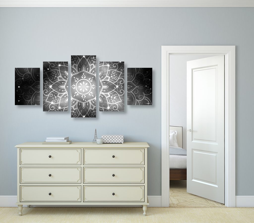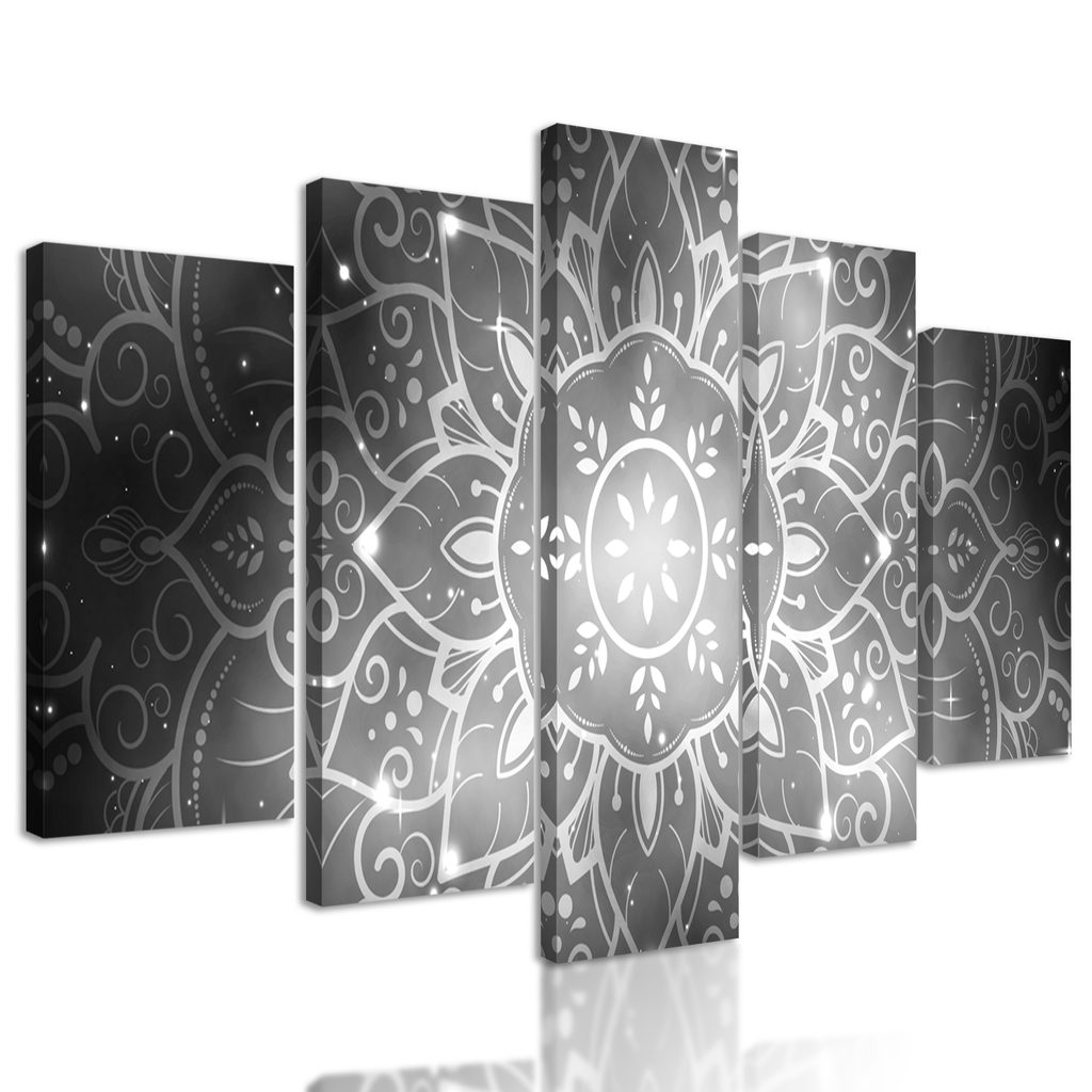 5-dielny obraz Mandala s vesmírnym pozadím v čiernobielom prevedení
