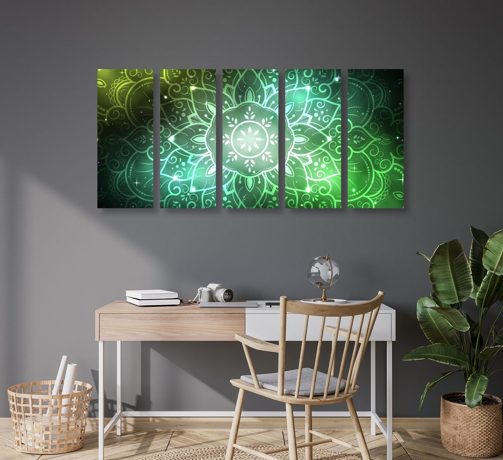 5-dielny obraz Mandala s vesmírnym pozadím v zelenom prevedení