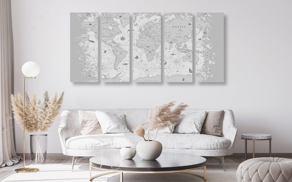 5-dielny obraz mapa sveta s historickým nádychom v čiernobielom prevedení