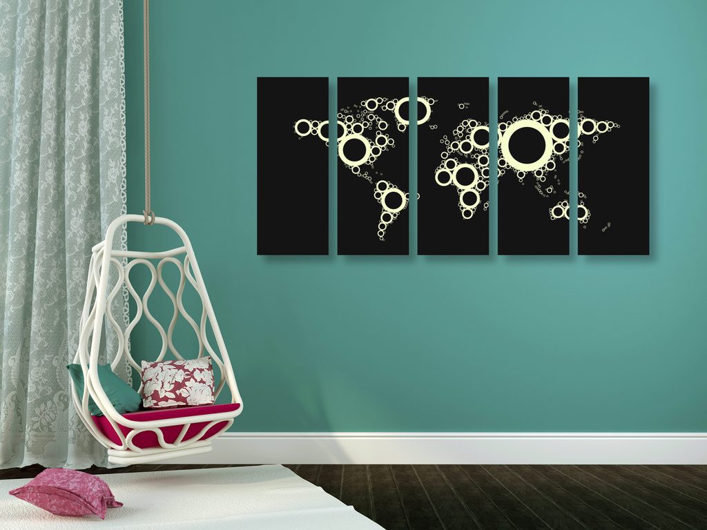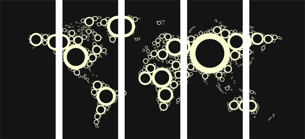 5-dielny obraz mapa sveta tvorená kružnicami v čiernobielom prevedení