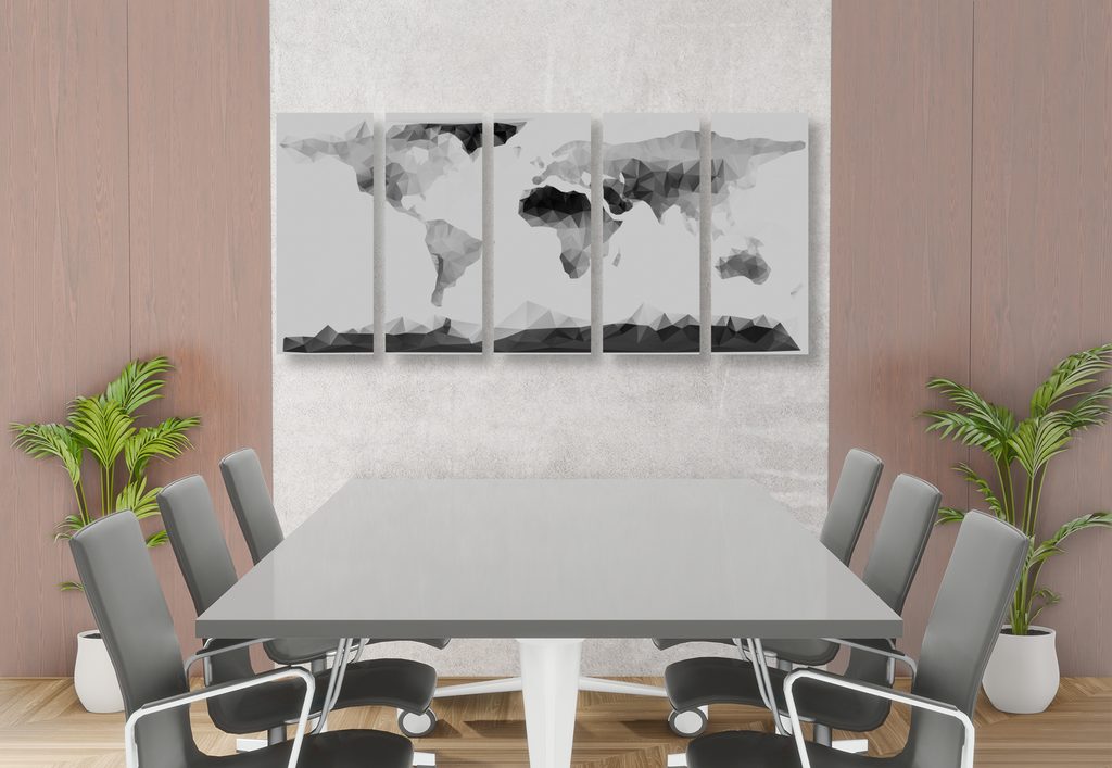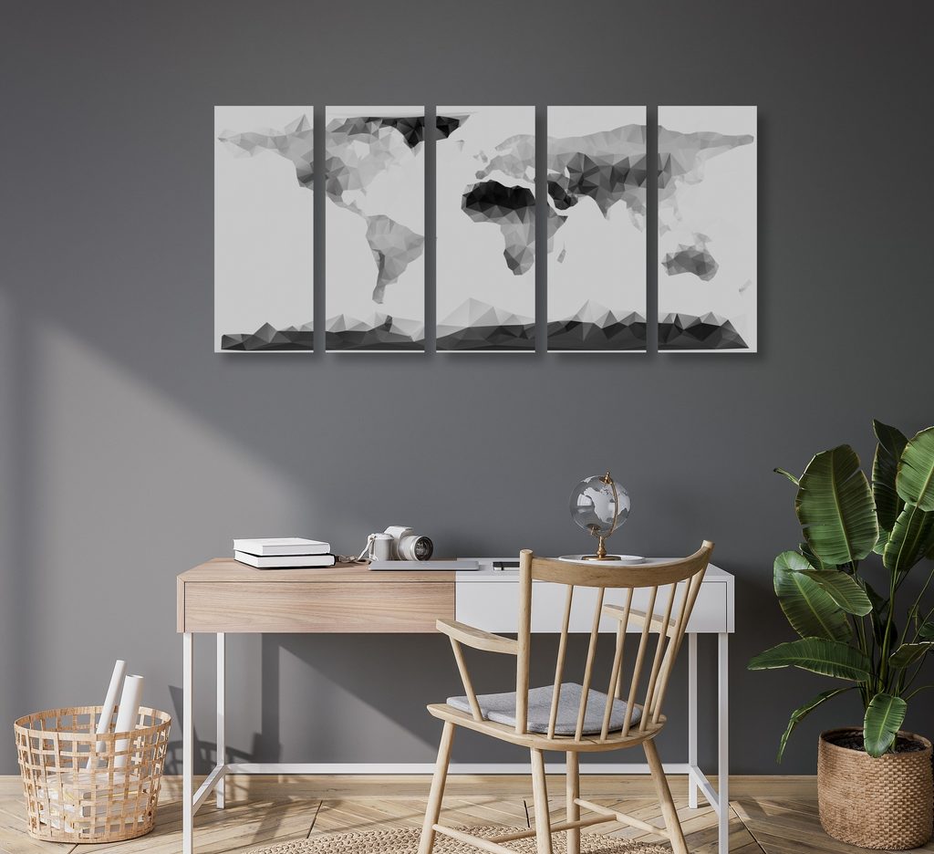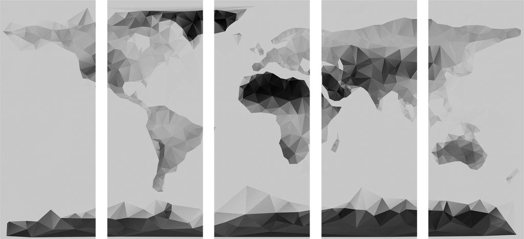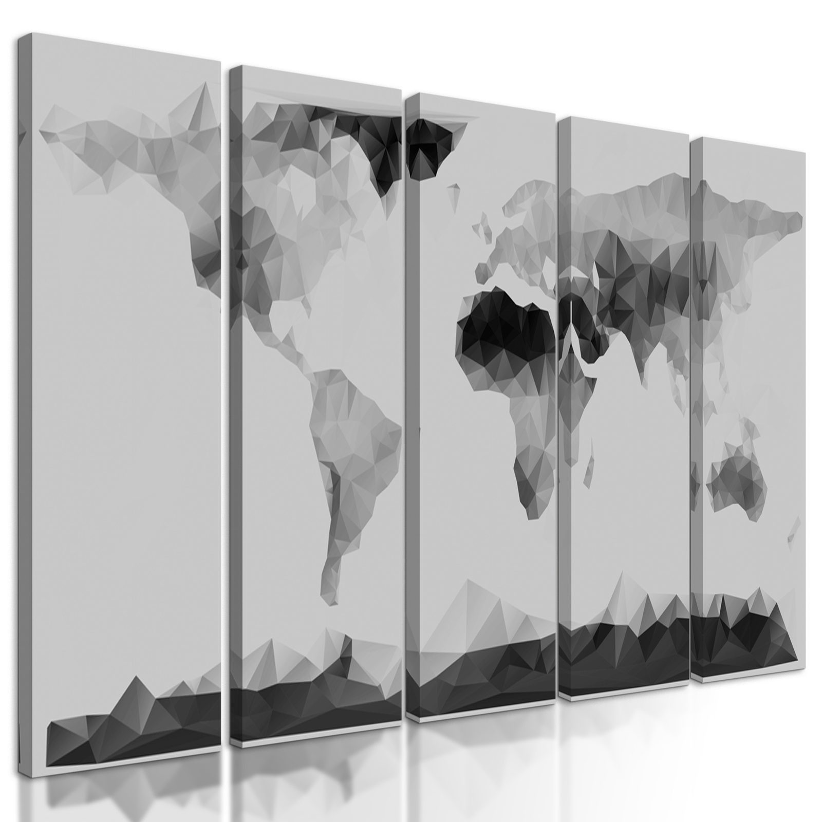 5-dielny obraz mapa sveta tvorená mnohouholníkmi v čiernobielom prevdení