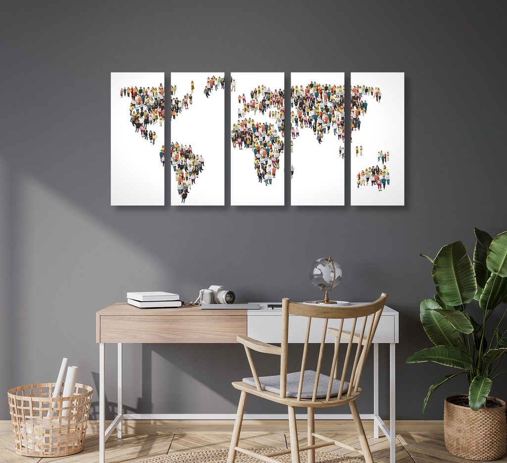 5-dielny obraz abstraktná mapa celého sveta v čiernobielom prevedení