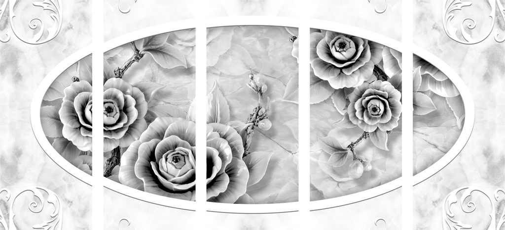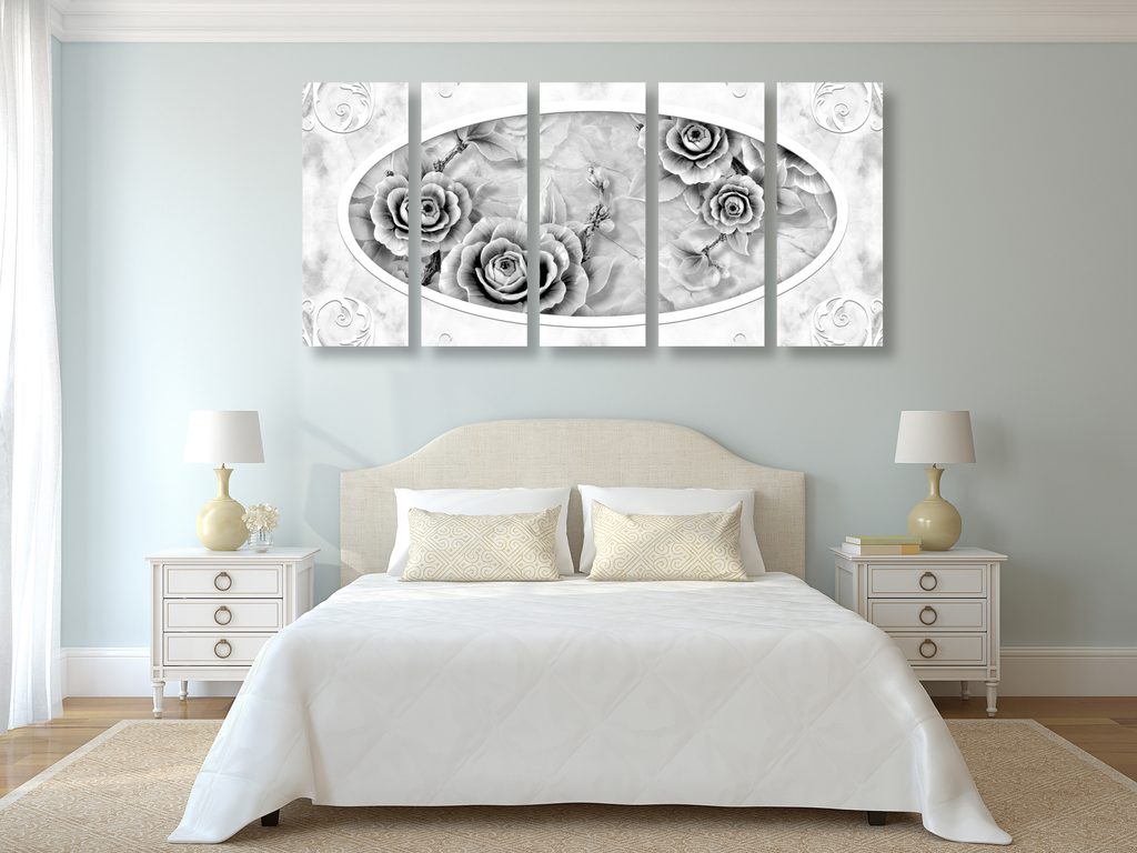 5-dielny obraz nádherné historické ruže v čiernobielom prevedení