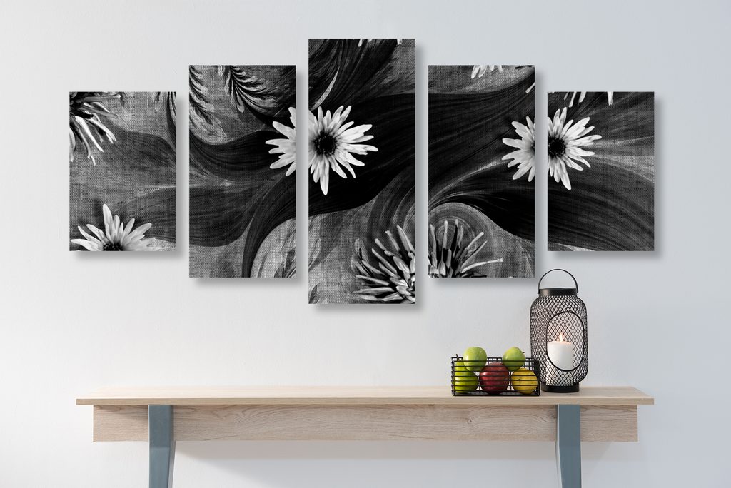 5-dielny obraz nádherné kvety s tajomným pozadím v čiernobielom prevedení