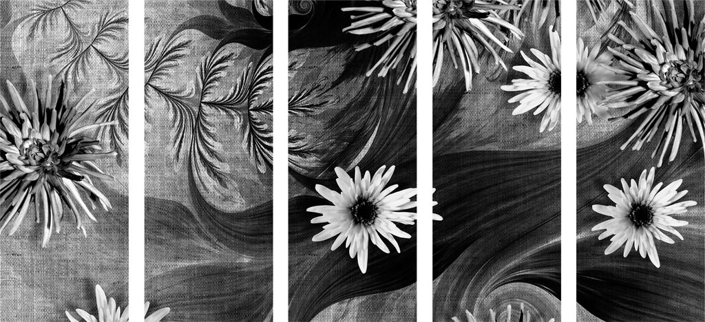 5-dielny obraz nádherné kvety s tajomným pozadím v čiernobielom prevedení